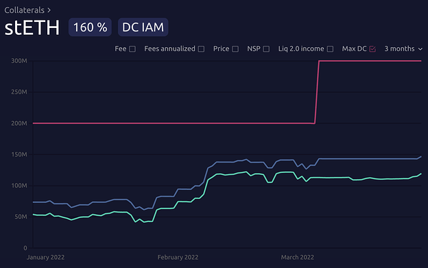 The proposed changes, if confirmed, should reduce yearly revenue by about 6 million DAI (~8%), due to roughly 100M reduction in expected debt exposure to the Aave D3M as well as stability fee reductions on stETH and WBTC collateral types.