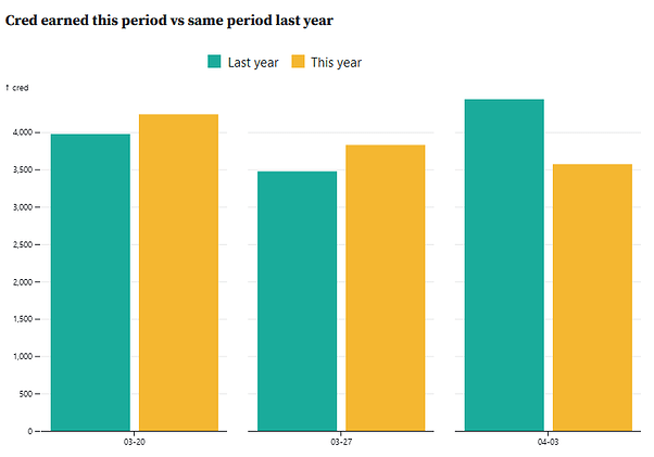A total of 11.637 Cred have been generated in these three weeks, with 120 topics and 1217 posts created. As we can see in the first graph below, the activity has been steadily declining, approaching the values of mid-February, the lowest recorded so far this year. However, the second graph shows the similarities in production compared to the previous year, suggesting a certain seasonality in the levels of Cred generated.
