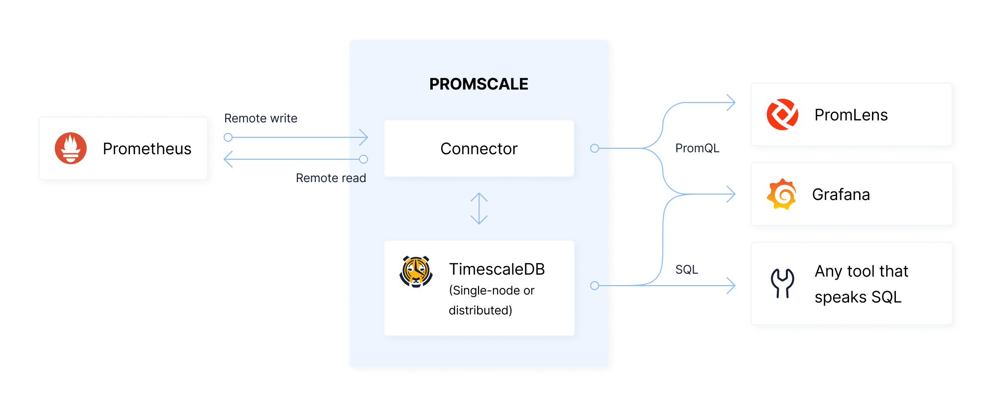 # Getting Started with Prometheus and TimescaleDB using Promscale ## Introduction [Prometheus][prometheus-webpage] is an open-source systems monitoring and alerting toolkit that can be used to easily and cost-effectively monitor infrastructure and applications. Over the past few years, Prometheus has emerged as the monitoring solution for modern software systems. The key to Prometheus’ success is its pull-based architecture and service discovery, which is able to seamlessly monitor modern, dynamic systems in which (micro-)services startup and shutdown frequently. **The Problem: Prometheus is not designed for analytics** As organizations use Prometheus to collect data from more and more of their infrastructure, the benefits from mining this data also increase. Analytics becomes critical for auditing, reporting, capacity planning, prediction, root-cause analysis, and more. Prometheus's architectural philosophy is one of simplicity and extensibility. Accordingly, it does not itself provide durable, highly-available long-term storage or advanced analytics, but relies on other projects to implement this functionality. There are existing ways to durably store Prometheus data, but while these options are useful for long-term storage, they only support the Prometheus data model and query model (limited to the PromQL query language). While these work extremely well for the simple, fast analyses found in dashboarding, alerting, and monitoring, they fall short for more sophisticated analysis capabilities, or for the ability to enrich their dataset with other sources needed for insight-generating cross-cutting analysis. **Solution: Promscale scales and augments Prometheus for long-term storage and analytics** [Promscale][promscale-github] is an open-source long-term store for Prometheus data, designed for analytics. It is a horizontally scalable and operationally mature platform for Prometheus data. Promscale offers the combined power of PromQL and SQL, enabling you to ask any question, create any dashboard, and achieve greater visibility into your systems. Promscale is built on top of TimescaleDB, the leading relational database for time-series. Promscale also supports native compression, handles high-cardinality, provides rock-solid reliability, and more. Furthermore, it offers other native time-series capabilities, such as data retention policies, continuous aggregate views, downsampling, data gap-filling, and interpolation. It is already natively supported by Grafana via the Prometheus and PostgreSQL/TimescaleDB data sources. > :TIP: For an overview of Promscale, see this short introductory video: [Intro to Promscale - Advanced analytics for Prometheus][promscale-intro-video]. In this document, you will learn: 1. The benefits of using Promscale to store and analyze Prometheus metrics 2. How Promscale works 3. How to install Prometheus, Promscale and TimescaleDB 4. How to run queries in PromQL and SQL against Promscale ## 1. Why use Promscale & TimescaleDB to store Prometheus metrics [](why-promscale) This section details five reasons to use Timescale and Promscale to store Prometheus metrics: 1. Long term data storage 2. Operational ease 3. Queries in SQL and PromQL 4. Per Metric Retention 5. Ability to push data from custom applications ### 1.1 Long term data storage In order to keep Prometheus simple and easy to operate, its creators intentionally left out many scaling features one would normally expect. Data in Prometheus is stored locally within the instance and is not replicated. Having both compute and data storage on one node may make it easier to operate, but also makes it harder to scale and ensure high availability. As a result, Prometheus is not designed to be a long-term metrics store. From the [documentation][prometheus storage docs]: >Prometheus is not arbitrarily scalable or durable in the face of disk or node outages and should thus be treated as more of an ephemeral sliding window of recent data. On the other hand, TimescaleDB can easily handle petabytes of data, and supports high availability and replication, making it a good fit for long term data storage. In addition, it provides advanced capabilities and features, such as full SQL, JOINs and data retention and aggregation policies, all of which are not available in Prometheus. Using Promscale as a long term store for Prometheus metrics works as follows: * All metrics that are scraped from targets are first written to the Prometheus local storage. * Metrics are then written to Promscale via the Prometheus `remote-write` endpoint. * This means that all of your metrics are ingested in parallel to TimescaleDB using Promscale, making any Prometheus disk failure less painful. TimescaleDB can also store other types of data (metrics from other systems, time-series data, relational data, metadata), allowing you to consolidate monitoring data from different sources into one database and simplify your stack. You can also join different types of data and add context to your monitoring data for richer analysis, using SQL `JOIN`s. Moreover, the recent release of [TimescaleDB 2.0][multinode-blog] introduces multi-node functionality, making it easier to scale horizontally and store data at petabyte scale. ### 1.2 Operational ease Promscale is an exception. Promscale operates as a single stateless service. This means that once you configure the `remote-write` & `remote-read` endpoints in your prometheus configuration file then all samples forwarded to Promscale. Promscale then handles the ingestion of samples into TimescaleDB. Promscale exposes all Prometheus compatible APIs, allowing you to query Promscale using PromQL queries. Moreover, the only way to scale Prometheus is by [federation][prometheus-federation]. However, there are cases where federation is not a good fit: for example, when copying large amounts of data from multiple Prometheus instances to be handled by a single machine. This can result in poor performance, decreased reli