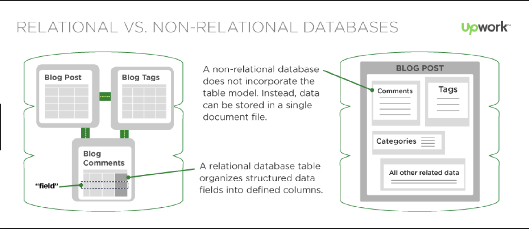 The major difference between MongoDB and SQL Databases is the way they handle data. In SQL databases, data is stored in form of traditional 2 dimensional row-column structure while in MongoDB rich data document model is followed, which allows storage of any type of data.