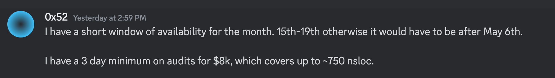 0x52 charges $8k for a 3 day audit. (\~2.5 ETH). The proposed changes would fit within the `750 nsloc` limit.