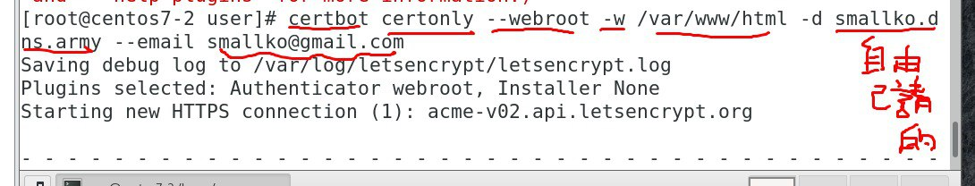 `[root@mycentos7-1 ~]# certbot certonly --webroot -w /var/www/html/ -d yourdomain.dns.army --email youremail`