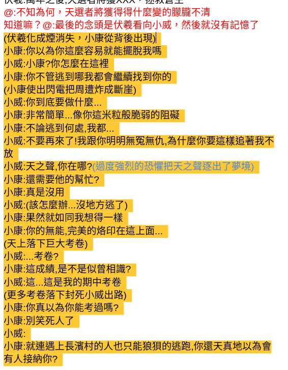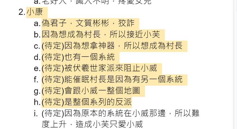 --- title: 翻轉歷史! 8/6 會議紀錄 tags: 會議記錄 lang: zh-tw image: https://i.imgur.com/jaauYQ0.png description: 8/6 的會議紀錄 --- # 第二次定期會議記錄 :::info 日期:8/6 開始時間:12:32 參與者:skywind5487、台灣人、呱呱呱、快遞、faling、菘菘、LingYue 寒月 ::: # 議程 - [文案](#文案) - [地圖](#地圖) - [伺服器](#伺服器) ## 文案 ### 小威夢境最後一段  [文案位置](https://docs.google.com/document/d/1mUoSJNEq5sHXZ0JDvcL_dGIPQZl5gbrpT0cMRsiEiKg/edit?usp=sharing) 選擇折衷方案,改一部份 ### 小康隱藏設定  ### 描寫推薦  用白描法就將人的性格、特徵都猜個7788了   理想中的小康模板  寫作技巧--似乎=不是 EX:她似乎是記憶裡的那個人->她90%不是記憶裡的那個人(可能是女兒之類的?) ### [史前大綱](https://docs.google.com/document/d/1BwS5HMBeXZf73iGbV1QwMgI22tKT-2fsgS8Bk4hLLdY/edit?usp=sharing) 完成 需要細化 圓山跟十三行的劇情 > [name=菘菘] 提議文案按照 [《中文文案排版指北》](https://github.com/sparanoid/chinese-copywriting-guidelines) 編寫 ## 地圖 #### 材質包 材質包要統一,避免不同人蓋出來的效果不同 先用原版材質包,有需要再加需要的材質 #### 第一個關卡紀錄點太多 拆掉太接近入口的紀錄點,留一個在中間的 #### 小威夢境新房問題 不重蓋擴建現有的 #### 玩家基地(意識空間) 關卡結束後會有按鈕可以傳送到玩家基地 #### 任務沒獎品 會給獎品,詳細內容另外討論 可能是下個關卡的必要內容、物資 #### 把卑南到圓山弄成永夜,需要一邊插火把一邊前進 CTM模式模式,不走出特定範圍就隨便他生存 #### 因為劇情需要的魔改 可以,但要補充說明 #### 小威有關科技的記憶消失 #### 建築風格統整 #### 符合史實 #### 是否要使用模組&datapeck 盡量不要,但有需要就用 - 地圖長度 - 章節間的物品保留 - 卑南的獻祭小遊戲投擲器聲音 - 路上路燈改火把 - 章節間的物品繼承 ## 伺服器 - 開放時間 - 對外公開 - 商業模式 - 檔案備份 - 插件 - [x]讓基岩板能進(網址: skywind.sytes.net,埠為25560) - [x]修復skin - [x]把小木斧換成插件版 > [name=菘菘] 我認為這要等地圖做得差不多再來討論 ## 行政 開發教學 將會議記錄嵌入主文件 共作方式不明 ## 待辦事項 ### 指令組 - [ ] 研究[文章](https://forum.gamer.com.tw/C.php?bsn=18673&snA=197127&tnum=1 "https://forum.gamer.com.tw/C.php?bsn=18673&snA=197127&tnum=1")指令 - [ ] 想小遊戲 製作小遊戲模板,小遊戲列表: 1. - [ ] 砍樹 2. - [ ] 燒陶土 3. - [ ] 耕田 4. - [ ] 打(小)獵 5. - [ ] 研發可投擲火焰彈 移動原有指令區 - [ ] 長濱 - [ ] 卑南 ### "Lingyue" 補地形 1. - [ ] 長濱 1. - [ ] 長濱到卑南 2. - [ ] 卑南 - [ ] 繪製平面圖 ### 流星若風 - [ ] 整合地圖與對話(50%) - [x] 在巴哈重新宣傳 - [ ] RPMTW重新宣傳 ### 文案組 - [ ] 製作簡介(但不要像課本那麼煩) 1. - [ ] 長濱 2. - [ ] 卑南 - [ ] 想圓山大綱 - [ ] 想十三行大綱 - [ ] 想最後大綱 - [ ] 史前時代大綱整合 ## 下次議案 小威逃出長濱洞洞後山上有人繼續追,追到某處後傳送