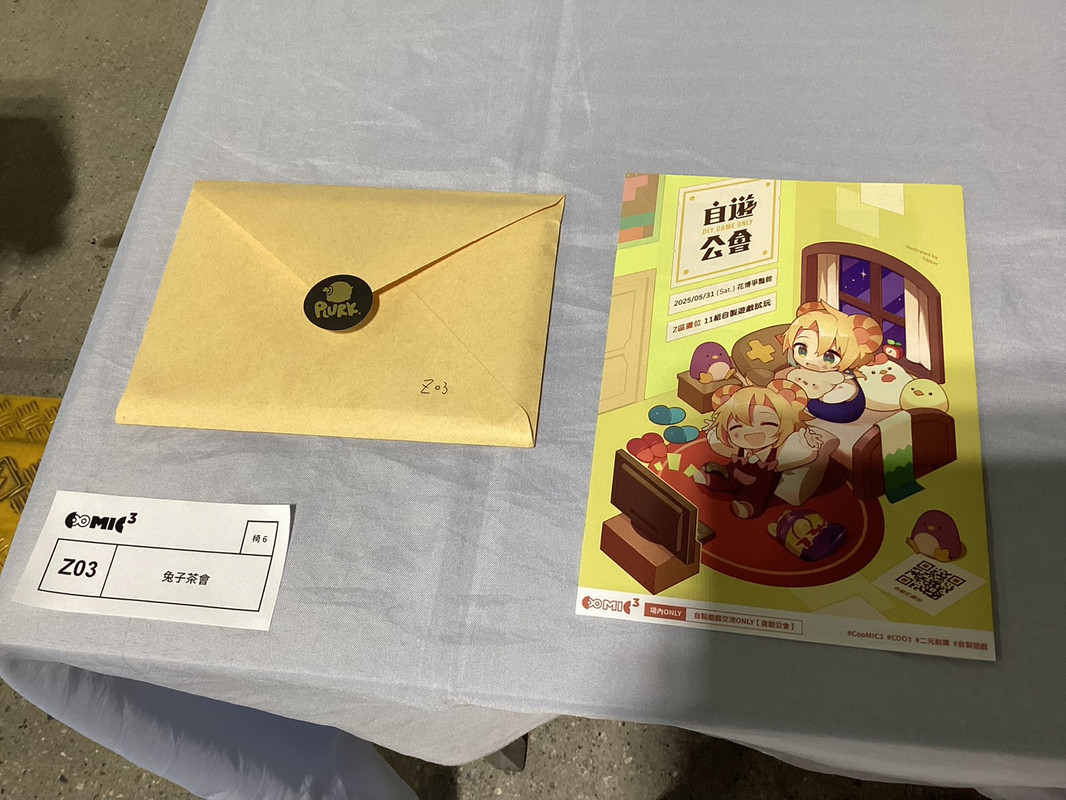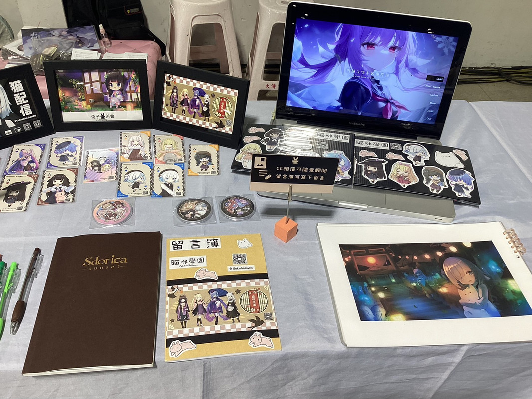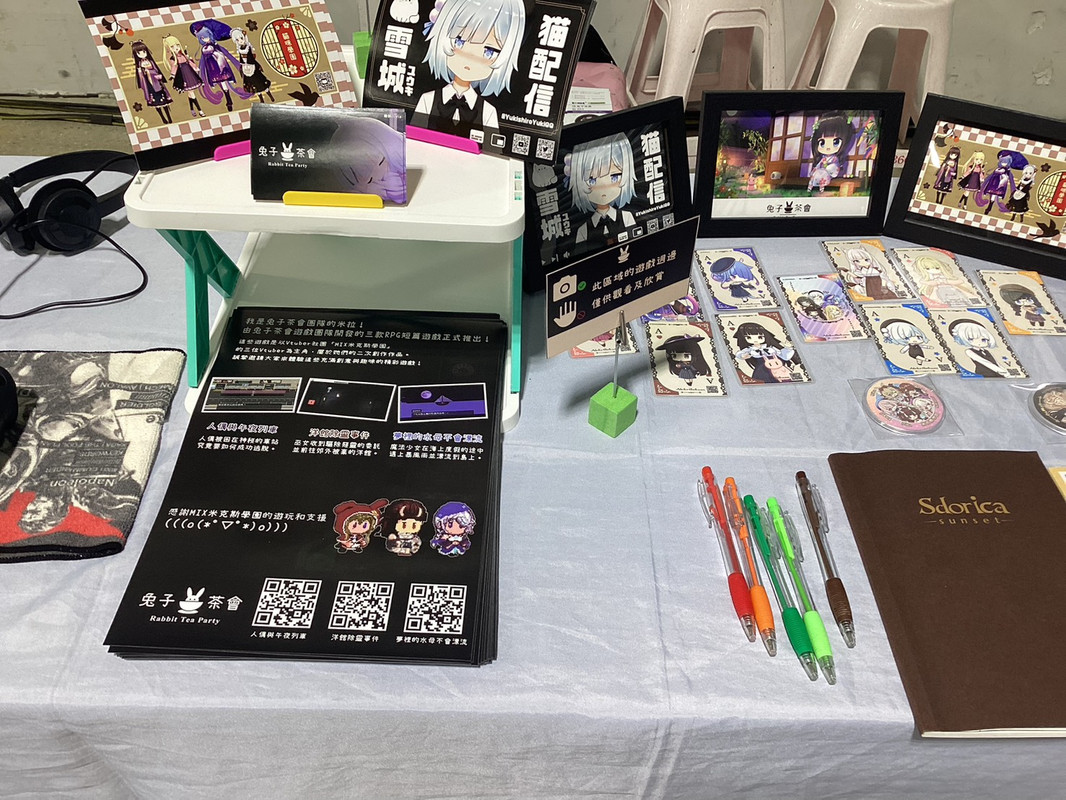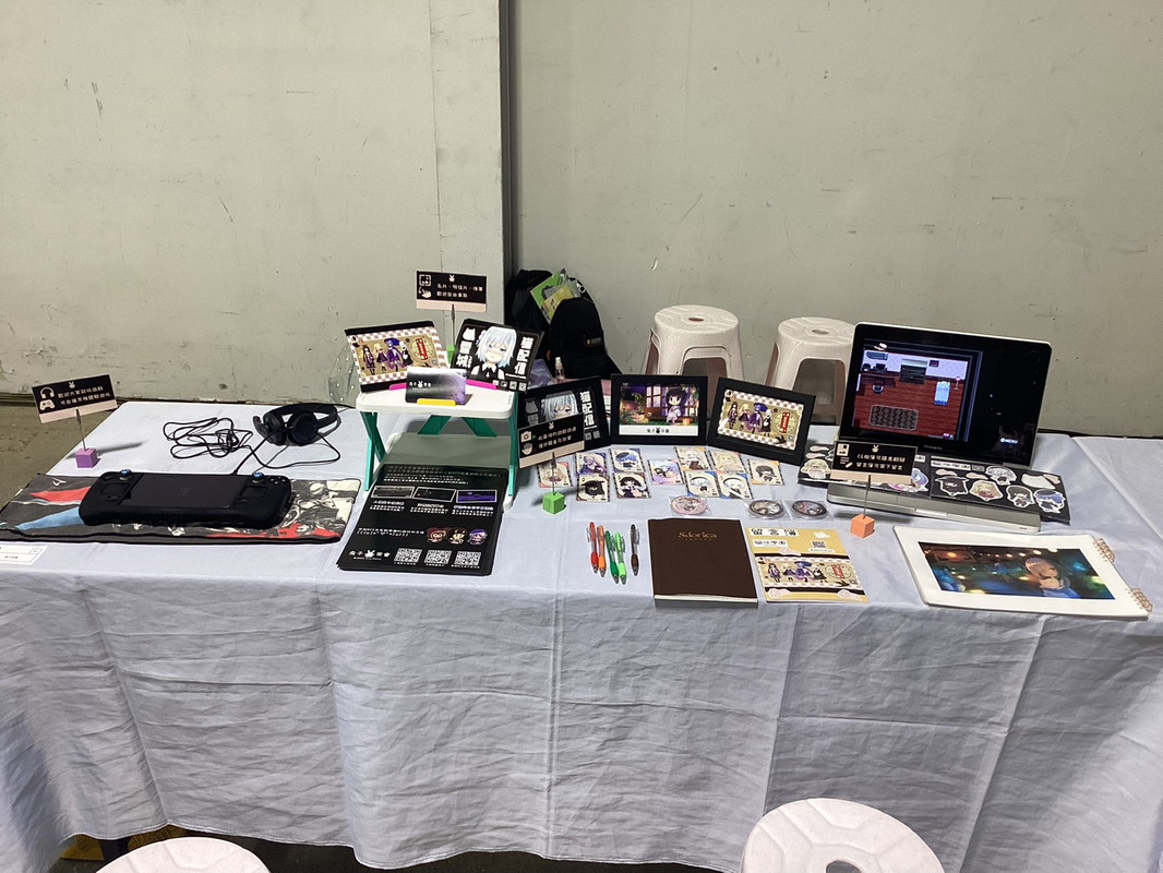 # 布穀町CooMIC二元創庫3 - 展覽心得  大家好,我是Mirai,如果你們大家有看過去年我發過的「[布穀町CooMIC二元創庫2 - 展覽心得](https://hackmd.io/@Mirai/BooGooTEAM_CooMIC2_cht)」這篇文章的話,今年於5/31布穀町官方所舉辦「二元創庫3」場次,「[自製遊戲公會](https://www.facebook.com/DIYGM/)」也再次為小眾遊戲及女性向遊戲的獨立遊戲開發者們有展出的機會,而我這次以「[兔子茶會](https://twitter.com/RabbitTeaPartyA)」的名義報名了這次的活動,並拜託我哥再次替我擺攤囉~ 接下來這次一樣會根據我哥當天活動後的講給我聽的內容,跟大家簡單介紹我們展前時的準備,以及當天活動展出的一些過程,至於這次我會以「兔子茶會」的名義報名這次活動,我後面也會稍微解釋下原因。 首先,大約去年11/5左右,布穀町官方於各大社群網站宣布今年的5/31將舉辦「二元創庫3」場次。   然後,我看到這次「二元創庫3」活動預告的貼文之中,有看到「自製遊戲ONLY」的字樣之後,我開始心動起來了,只是那時候我還在猶豫要不要不要花1600元攤位費報名5/31「二元創庫3」,還是參加免費報名「巴哈姆特週年站聚」的板攤區。  不過後來我哥的兩位朋友願意資助我1600元讓我參展「二元創庫3」的場次,然後關於前面提到這次展出名義是以我成立的「兔子茶會」這點,其實是「[貓咪學園](https://twitter.com/nekogakuen)」的團長鼓勵我嘗試用「兔子茶會」來增加自己成立「兔子茶會」對外的印象,以及我自己創作的名聲。 之後2/19左右開放社團報名,我這邊是透過「自製遊戲公會」提供的表單進行攤位報名,之後等待4月初公布正式錄取的社團名單。  對了,這邊要提及下今年的我其實開發了以Vtuber社團「[MIX米克斯學園](https://twitter.com/MixMimimix)」的其中三位個人勢Vtuber的二次創作的小遊戲,並且有先徵求過她們的同意才開發了三款小遊戲,分別是2/22的「[栗可蓓歐](https://twitter.com/RikaAntique)」的兩週年的小遊戲「[人偶與午夜列車](https://miraisosad.itch.io/rika99-and-midnight-train)」,3/13的「[鬼塚魅華](https://twitter.com/onizukamika)」的四週年的小遊戲「[洋館除靈事件](https://miraisosad.itch.io/mika-and-spooky-manor-exorcism-case)」,以及5/12的「[伊波悠月](https://twitter.com/Inami_Yuzuki)」的兩週年的小遊戲「[夢裡的水母不會漂流](https://miraisosad.itch.io/inami-and-jellyfish-cannot-drift-in-dreams)」,之後我預計會繼續開發「[星花露娜娜](https://twitter.com/runanakawaii)」和「[鬼塚夏實](https://twitter.com/onizukanatsumi)」二次創作的小遊戲。 這次是以我的「兔子茶會」名義報名的緣故,所以這次我可以擺上「MIX米克斯學園」的三款二次創作的小遊戲給大家試玩,而這次公布的正式社團名單我們是在「Z03」攤位。 為此我在展前準備了很多,例如印製新的「兔子茶會」的名片、新的「兔子茶會」的展場小字卡,以及「MIX米克斯學園」的三款二次創作的小遊戲的「DM宣傳單」,而且這次一樣布穀町官方也準備了提供「徽章紙」製作徽章的活動。   我們委託[Via老師](https://twitter.com/Viathanxz)繪製了兩顆貓咪學園的睡衣徽章,以及我個人委託Via老師的「MIX米克斯學園」的徽章,由於這次的徽章不只有「貓咪學園」,也有我基於Vtuber社團「MIX米克斯學園」成員的二創徽章。 雖然這次我們沒有趕上徽章紙設計上傳的交件日期,但我有詢問過布穀町官方他們說,即使沒有趕上交件日期也可以使用自行印製的方式製作徽章紙,我也分享下這次製作的三款徽章紙設計的預覽效果。    我們在活動前幾週都在討論及製作一些展出給玩家試玩的遊戲,以及在社群平台發貼文定期宣傳等,包含給玩家們現場試玩遊戲用的Steam Deck主機、一些明信片及名片,還有給玩家留言的留言簿,以及現場展示觀賞用的週邊。   然後,關於這些週邊,一樣也非常感謝我們的神秘小幫手「[雪城友紀](https://twitter.com/YukishiroYukiQQ)」的幫助。   雖然我們有準備「雪城友紀」準備給我哥展出的耳機,只是當天活動擺在攤位桌上幾乎沒用到。  而這次我哥在網路上請了一位小精靈陪我哥當天活動一起輪流顧攤位。 接著在5/30的晚上我去了下「[不正經獨立遊戲冒險者增肥聚會](https://www.facebook.com/groups/186117435377067/)」,並且在那邊得到一些遊戲開發者給的在遊戲中需要改善的建議。 隔天早上,我哥提著行李箱在花博爭豔館等待小精靈的到來,大約九點多我哥跟小精靈入場後開始佈置攤位。       當佈置完之後攤位,我哥在活動開始之前,先去製作幾枚徽章,雖然我哥好像一開始做壞了兩顆徽章,而且這次的徽章一顆需要20元工本費。       然後,我哥也跟「[AirBoost:天空機士](https://store.steampowered.com/app/2325390/AirBoost/)」的攤主「KO」交換了兩枚徽章,也跟「[幽暗森林裡的糖果屋](https://store.steampowered.com/app/1788060/_/)」的攤主「CHAyE」交換到徽章紙,以及送了一枚徽章給「貘貘耕耘」的攤主等,並且我哥也幫忙我把我前幾天寫給「自製遊戲公會」的感謝信送到他們的攤位,至於我感謝信寫了什麼內容才不告訴你們。 接著,我哥也跟Z05攤位「詭寓」的小精靈「[射破衛生紙](https://www.threads.com/@mr.fuya)」稍微聊了下獨立遊戲的相關話題。 之後等到上午10:30之後玩家開始入場,不過還是一無往常的上午開始的時段,都是悠悠哉哉的輕鬆時間。 對了,這次「自製遊戲公會」的攤位有準備了抽獎活動,只要集滿9個章就能抽獎,所以「自製遊戲公會」給