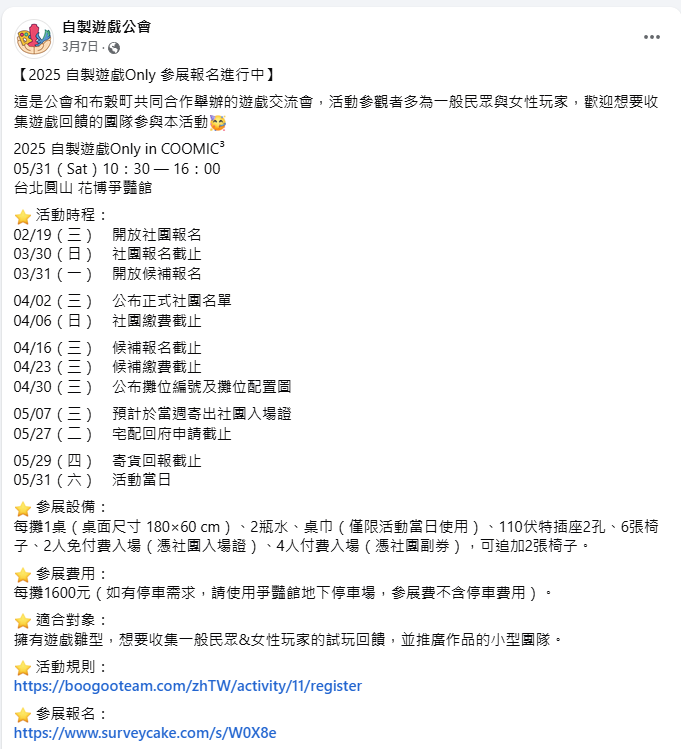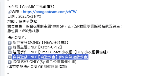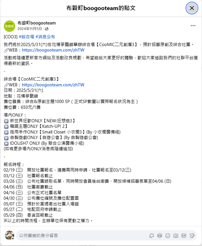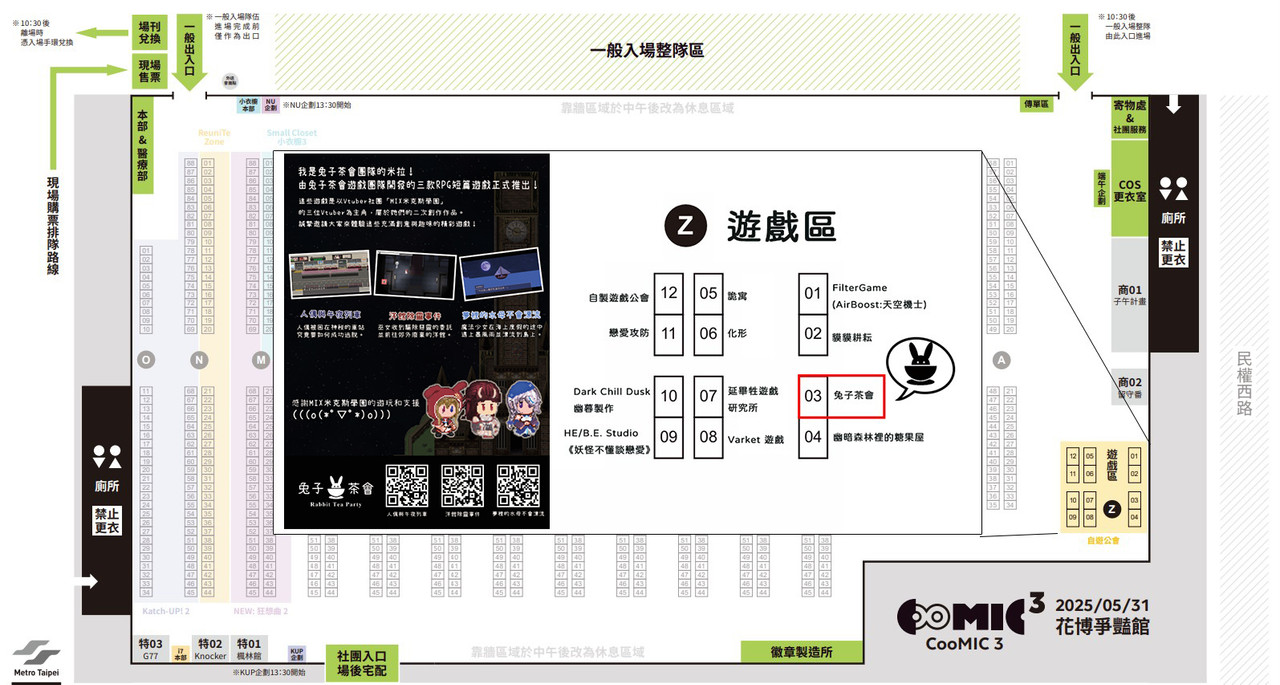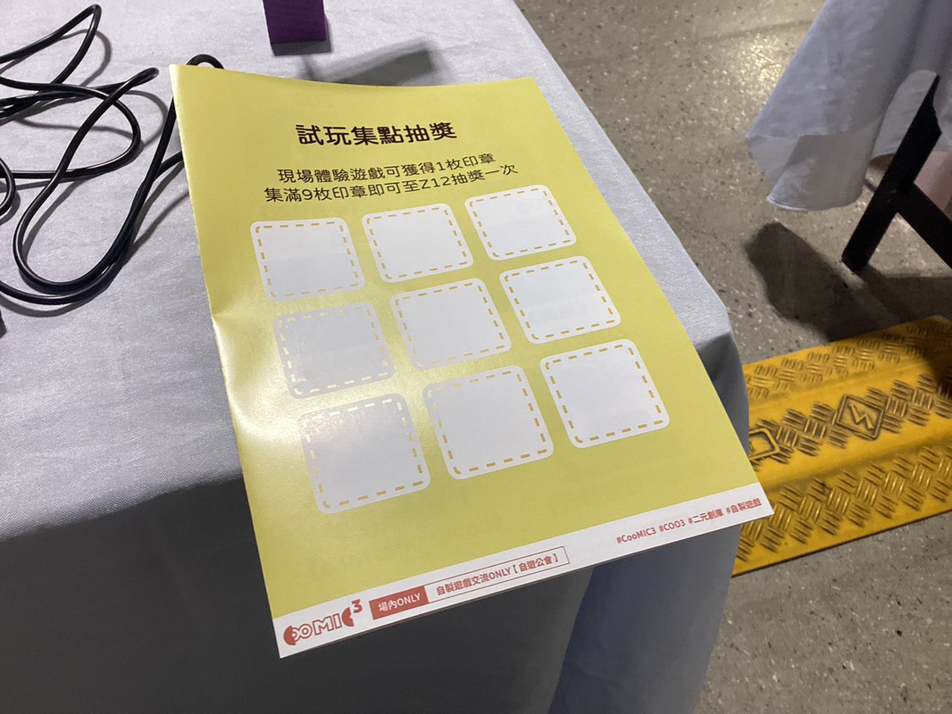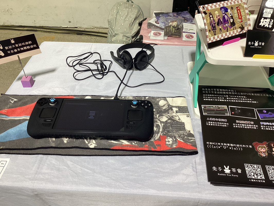 # 布穀町CooMIC二元創庫3 - 展覽心得  大家好,我是Mirai,如果你們大家有看過去年我發過的「[布穀町CooMIC二元創庫2 - 展覽心得](https://hackmd.io/@Mirai/BooGooTEAM_CooMIC2_cht)」這篇文章的話,今年於5/31布穀町官方所舉辦「二元創庫3」場次,「[自製遊戲公會](https://www.facebook.com/DIYGM/)」也再次為小眾遊戲及女性向遊戲的獨立遊戲開發者們有展出的機會,而我這次以「[兔子茶會](https://twitter.com/RabbitTeaPartyA)」的名義報名了這次的活動,並拜託我哥再次替我擺攤囉~ 接下來這次一樣會根據我哥當天活動後的講給我聽的內容,跟大家簡單介紹我們展前時的準備,以及當天活動展出的一些過程,至於這次我會以「兔子茶會」的名義報名這次活動,我後面也會稍微解釋下原因。 首先,大約去年11/5左右,布穀町官方於各大社群網站宣布今年的5/31將舉辦「二元創庫3」場次。   然後,我看到這次「二元創庫3」活動預告的貼文之中,有看到「自製遊戲ONLY」的字樣之後,我開始心動起來了,只是那時候我還在猶豫要不要不要花1600元攤位費報名5/31「二元創庫3」,還是參加免費報名「巴哈姆特週年站聚」的板攤區。  不過後來我哥的兩位朋友願意資助我1600元讓我參展「二元創庫3」的場次,然後關於前面提到這次展出名義是以我成立的「兔子茶會」這點,其實是「[貓咪學園](https://twitter.com/nekogakuen)」的團長鼓勵我嘗試用「兔子茶會」來增加自己成立「兔子茶會」對外的印象,以及我自己創作的名聲。 之後2/19左右開放社團報名,我這邊是透過「自製遊戲公會」提供的表單進行攤位報名,之後等待4月初公布正式錄取的社團名單。  對了,這邊要提及下今年的我其實開發了以Vtuber社團「[MIX米克斯學園](https://twitter.com/MixMimimix)」的其中三位個人勢Vtuber的二次創作的小遊戲,並且有先徵求過她們的同意才開發了三款小遊戲,分別是2/22的「[栗可蓓歐](https://twitter.com/RikaAntique)」的兩週年的小遊戲「[人偶與午夜列車](https://miraisosad.itch.io/rika99-and-midnight-train)」,3/13的「[鬼塚魅華](https://twitter.com/onizukamika)」的四週年的小遊戲「[洋館除靈事件](https://miraisosad.itch.io/mika-and-spooky-manor-exorcism-case)」,以及5/12的「[伊波悠月](https://twitter.com/Inami_Yuzuki)」的兩週年的小遊戲「[夢裡的水母不會漂流](https://miraisosad.itch.io/inami-and-jellyfish-cannot-drift-in-dreams)」,之後我預計會繼續開發「[星花露娜娜](https://twitter.com/runanakawaii)」和「[鬼塚夏實](https://twitter.com/onizukanatsumi)」二次創作的小遊戲。 這次是以我的「兔子茶會」名義報名的緣故,所以這次我可以擺上「MIX米克斯學園」的三款二次創作的小遊戲給大家試玩,而這次公布的正式社團名單我們是在「Z03」攤位。 為此我在展前準備了很多,例如印製新的「兔子茶會」的名片、新的「兔子茶會」的展場小字卡,以及「MIX米克斯學園」的三款二次創作的小遊戲的「DM宣傳單」,而且這次一樣布穀町官方也準備了提供「徽章紙」製作徽章的活動。   我們委託[Via老師](https://twitter.com/Viathanxz)繪製了兩顆貓咪學園的睡衣徽章,以及我個人委託Via老師的「MIX米克斯學園」的徽章,由於這次的徽章不只有「貓咪學園」,也有我基於Vtuber社團「MIX米克斯學園」成員的二創徽章。 雖然這次我們沒有趕上徽章紙設計上傳的交件日期,但我有詢問過布穀町官方他們說,即使沒有趕上交件日期也可以使用自行印製的方式製作徽章紙,我也分享下這次製作的三款徽章紙設計的預覽效果。    我們在活動前幾週都在討論及製作一些展出給玩家試玩的遊戲,以及在社群平台發貼文定期宣傳等,包含給玩家們現場試玩遊戲用的Steam Deck主機、一些明信片及名片,還有給玩家留言的留言簿,以及現場展示觀賞用的週邊。   然後,關於這些週邊,一樣也非常感謝我們的神秘小幫手「[雪城友紀](https://twitter.com/YukishiroYukiQQ)」的幫助。   雖然我們有準備「雪城友紀」準備給我哥展出的耳機,只是當天活動擺在攤位桌上幾乎沒用到。  而這次我哥在網路上請了一位小精靈陪我哥當天活動一起輪流顧攤位。 接著在5/30的晚上我去了下「[不正經獨立遊戲冒險者增肥聚會](https://www.facebook.com/groups/186117435377067/)」,並且在那邊得到一些遊戲開發者給的在遊戲中需要改善的建議。 隔天早上,我哥提著行李箱在花博爭豔館等待小精靈的到來,大約九點多我哥跟小精靈入場後開始佈置攤位。       當佈置完之後攤位,我哥在活動開始之前,先去製作幾枚徽章,雖然我哥好像一開始做壞了兩顆徽章,而且這次的徽章一顆需要20元工本費。       然後,我哥也跟「[AirBoost:天空機士](https://store.steampowered.com/app/2325390/AirBoost/)」的攤主「KO」交換了兩枚徽章,也跟「[幽暗森林裡的糖果屋](https://store.steampowered.com/app/1788060/_/)」的攤主「CHAyE」交換到徽章紙,以及送了一枚徽章給「貘貘耕耘」的攤主等,並且我哥也幫忙我把我前幾天寫給「自製遊戲公會」的感謝信送到他們的攤位,至於我感謝信寫了什麼內容才不告訴你們。 接著,我哥也跟Z05攤位「詭寓」的小精靈「[射破衛生紙](https://www.threads.com/@mr.fuya)」稍微聊了下獨立遊戲的相關話題。 之後等到上午10:30之後玩家開始入場,不過還是一無往常的上午開始的時段,都是悠悠哉哉的輕鬆時間。 對了,這次「自製遊戲公會」的攤位有準備了抽獎活動,只要集滿9個章就能抽獎,所以「自製遊戲公會」給