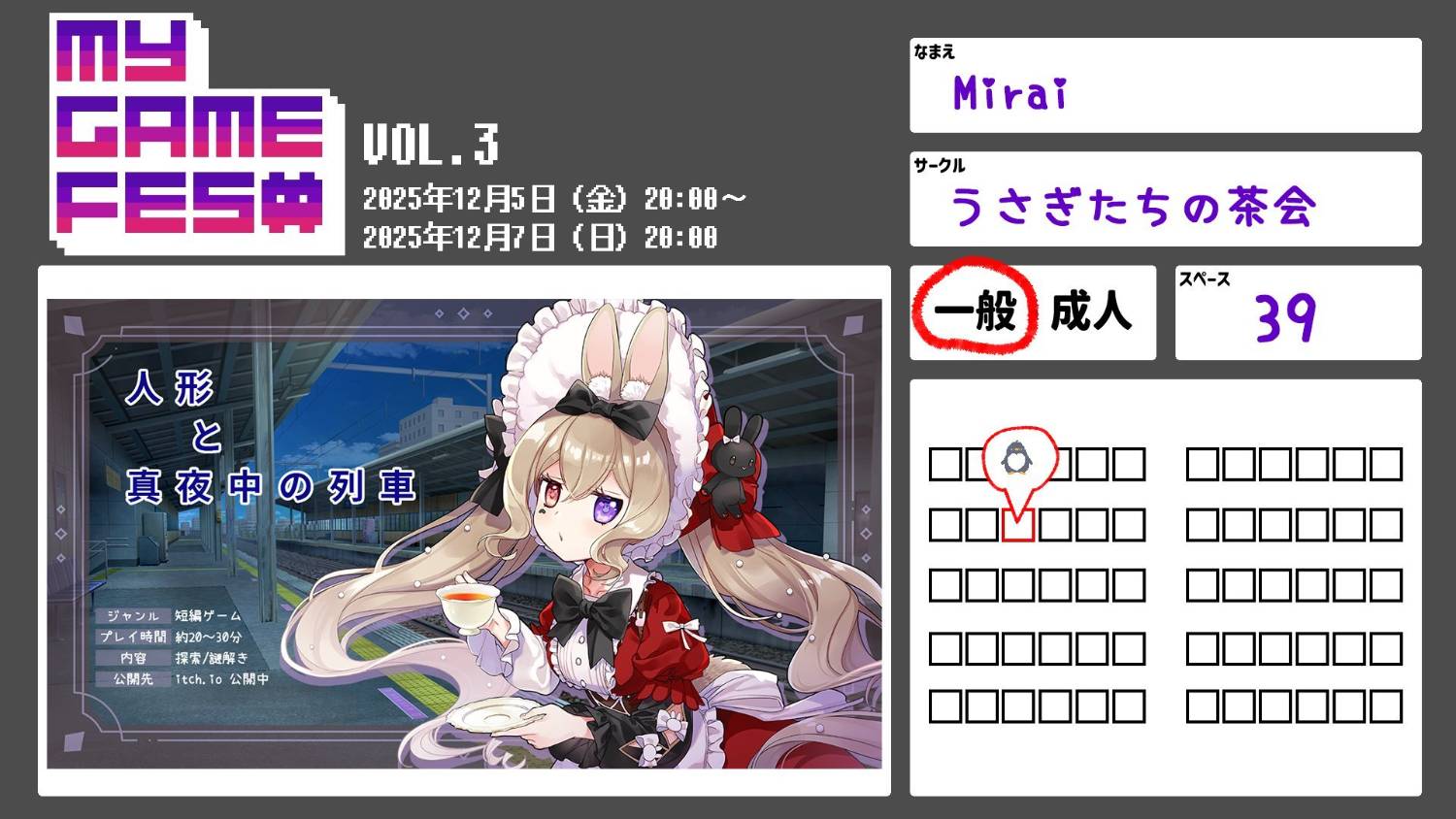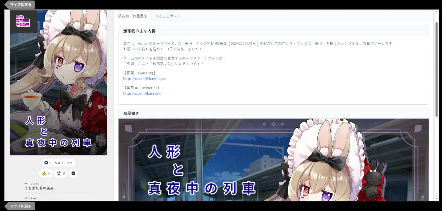 # MY GAME FES Vol.3 - オンラインイベント展示レポート はじめまして、同人ゲームサークル「兔子茶會 Rabbit Tea Party」の「Mirai」です。 今回は、日本の「PICREA(ピクリエ)」というプラットフォームで開催されたオンラインイベント「MY GAME FES Vol.3」について、体験レポートを共有したいと思います。 こちらのイベントは、日本のインディーゲーム開発者である「[星空照美](https://twitter.com/star_terumi)」さんが主催しているインディーゲームのオンライン展示イベントです。 私は6月中旬頃に Discord を通じて主催者へ問い合わせを行いましたが、主催者からは「インディーゲーム開発者であれば、年齢や国籍を問わず参加可能」との回答をいただきました。 ブースやゲーム内容が「日本語表記」であれば、参加費 880円(約180台湾ドル)で出展することが可能です。 日本市場への展開を考えているインディーゲーム開発者の方には、ぜひ検討してみる価値があるイベントだと思います。 #### 【INDIE GAME WEB EVENT『MY GAME FES』Vol.3 - オンラインイベントページ】 https://picrea.jp/event/66eba0f8578c53acb353d399405165153f066adaf9c6567bdd25b31fceb8a83e  今回のオンライン展示には、私が制作しているゲーム「[人形と真夜中の列車](https://freegame-mugen.jp/adventure/game_13607.html)」の日本語版で参加しました。 手元のプロジェクトの中で、日本語対応している作品がこの一本だけだったこともあり、「MY GAME FES」公式サイトに掲載されている日本語版の[参加規約](https://my-game-fes.jimdofree.com/参加について/)も一通り確認しながら準備を進めました。 また、「人形と真夜中の列車」のゲームパッケージに登場するメインキャラクター「[栗可](https://twitter.com/RikaAntique)」のキャラクタービジュアルは、イラストレーターの「[戦部露](https://twitter.com/ikusabelu)」先生にご提供いただいています。    今回のオンラインイベントは、今年の 5/10 〜 11/5 の期間で開催され、合計 59 ブースが募集されました。 私もこのイベントのために、Vtuberサークル「MIX」に所属する小さな精霊「深藍ペンギン」がブースを担当している、オリジナルのブースデザインを制作しました。  最後に、12/7 のイベント最終日には、今回参加した他の出展者の皆さんと一緒に記念撮影を行いました。 今後も数年にわたって、このようなオンラインイベントに参加し続けられたらと思っています。 そして、「MY GAME FES Vol.3」の主催者の皆さまが、海外からのインディーゲーム開発者である私たちを受け入れてくださったことに、心より感謝しています。  ###### tags: `展覽心得`
