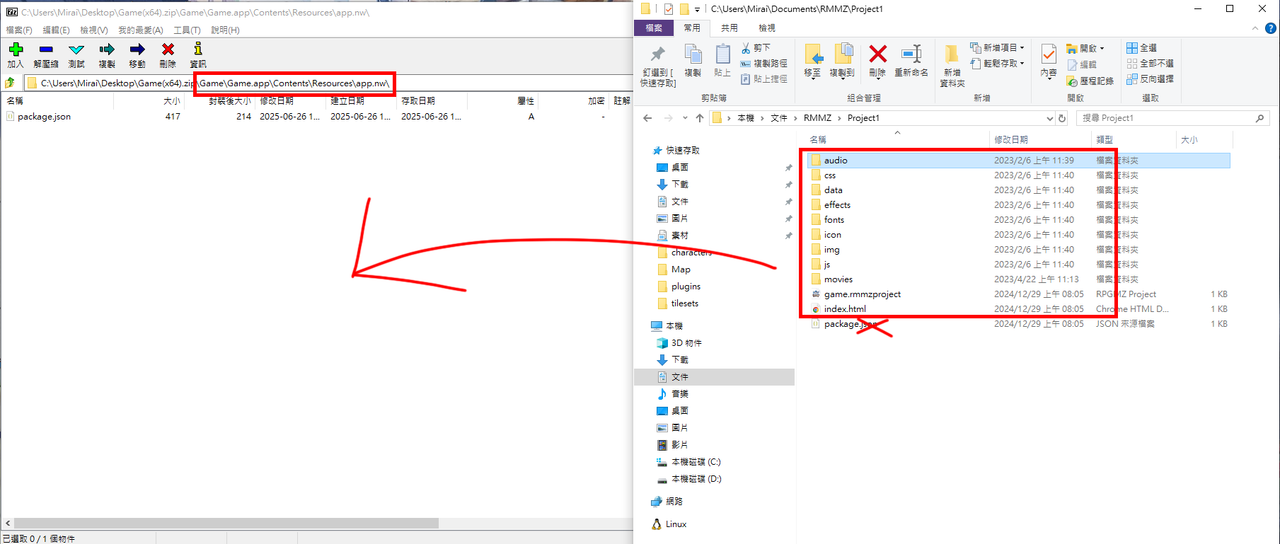 # 讓 RPG Maker MV/MZ 在 Windows 的環境之下也能簡單部署 macOS 版本 :::danger  ::: 首先,我相信有很多人都應該知道,如果要讓 RPG Maker MV/MZ 部署為 macOS 版本的話,一定得要擁有一台 Mac 電腦才行,因為如果你直接用 RPG Maker MV/MZ 內建的部署功能直接輸出 macOS 版本的話,當你在 Mac 電腦或是發給使用 Mac 電腦的朋友遊玩的話,將會發生如下圖的狀況....  所以我這次將使用 Windows 10(22H2) 的電腦環境之下進行簡單的教學。 首先,將下載連結的任何一個壓縮檔下載下來,看你的遊戲是用 NW.js 還是 Electron 執行的,當然這些是我幫大家在我那台破 Macbook 做好的執行檔。 :::info **<i class="fa fa-info-circle" aria-hidden="true"></i> 更新履歷** **2025/06/26** 更新文章的部分內容和更新下載連結。 **2022/05/03** 更新文章的部分內容。 **2022/04/15** 更新Electronjs版本為16.2.2,並新增修改版權文字的秘訣,以及macOS遊戲測試的申請表單。 ::: > **<i class="fa fa-download" aria-hidden="true"></i> 下載連結** > > --- **NW.js** https://drive.google.com/drive/folders/1pGc3uKOM_9LGhnMqv7M8CAWVsYqWIda5?usp=sharing > > --- **Electronjs** https://drive.google.com/file/d/1KkOOR9mUxH-TcxMMlBk_iy4iOCaEvsY3/view?usp=sharing :::info <i class="fa fa-info-circle" aria-hidden="true"></i> 在使用 NWjs 的情況下,如果你的 macOS 作業系統為 macOS Big Sur(版本11.0) 以上,請使用「Game(NWjs).zip」的壓縮檔,反之如果你的 macOS 作業系統為 macOS Catalina(版本10.15)以前的版本,請使用「Game(NWjs) - macOS 10.15以前版本(x64).zip」的壓縮檔。 ::: ## NW.js 版本 將你的 RPG Maker MV/MZ 遊戲部署為「網頁瀏覽器」版本。 接著,在 7-Zip 官方網站上下載對應作業系統的安裝檔,雖然其實也可以用 WinRAR 就是了。 然後,將下載好的壓縮檔用 7-Zip / WinRAR 開啟,但並不是要解壓縮,這點還請注意。 在 7-Zip / WinRAR 的**Game/Game.app/Contents/Resources/app.nw/** 的路徑之下,將你剛剛部署好的檔案(package.json除外),直接拉進壓縮檔內。  在 7-Zip / WinRAR 的**Game/Game.app/Contents/Resources/app.nw/** 的路徑之下把 package.json 打開,並編輯「name」和「title」的參數改為你自己的命名,如有變更預設的「width」跟「height」也要修改為你目前遊戲的解析度。  當然如果你也想要修改執行檔的 Icon 圖示的話,其實是可以修改的,首先,準備一張 png 格式的圖檔,並且上網搜尋「png 轉 icns 線上轉換」,如果說 Windows 指定圖示的檔案為 ico 格式的話,那 macOS 指定圖示的檔案就是 icns 格式這樣。 接著再到 7-Zip / WinRAR 的 **Game/Game.app/Contents/Resources/** 的路徑之下,將剛剛轉換好的 icns 圖檔重新命名為 app.icns,並且一樣拉進壓縮檔內直接取代。  ## Electron 版本 將你的 RPG Maker MV/MZ 遊戲部署為「網頁瀏覽器」版本,部署完之後,接著就照我以下文章的連結在 Windows 環境下輸出,並且在 package.json 打開,並編輯「asar」的參數改為 true。 **【Windows】使用 Electron 部署輸出 RPG Maker MV/MZ 遊戲** https://hackmd.io/@Mirai/rpg_maker_electron_win_cht  接著,在 7-Zip 官方網站上下載對應作業系統的安裝檔,雖然其實也可以用 WinRAR 就是了。 然後,將下載好的壓縮檔用 7-Zip / WinRAR 開啟,但並不是要解壓縮,這點還請注意。 在 7-Zip / WinRAR 的 **Game.app/Contents/Resources/** 的路徑之下, 在你剛剛部署好 Electron 資料夾的 **dist/win-unpacked/resources/** 把 **app.asar** 直接拉進壓縮檔內,  當然如果你也想要修改執行檔的 Icon 圖示的話,其實是可以修改的,首先,準備一張 png 格式的圖檔,並且上網搜尋「png 轉 icns 線上轉換」,如果說 Windows 指定圖示的檔案為 ico 格式的話,那 macOS 指定圖示的檔案就是 icns 格式這樣。 接著一樣再到 7-Zip / WinRAR 的 **Game.app/Contents/Resources/** 的路徑之下,將剛剛轉換好的 icns 圖檔重新命名為 electron.icns,並且一樣拉進壓縮檔內直接取代。  最後,我這邊也提供在macOS平台上幫忙測試遊戲的 Google 表單的申請連結。 [https://docs.google.com/forms/d/e/1FAIpQLSewTuah8wCQ3PSwyocsi_LpT1wIfsN0893NUUYw_o9qoJejjg/viewform?usp=sf_link](https://docs.google.com/forms/d/e/1FAIpQLSewTuah8wCQ3PSwyocsi_LpT1wIfsN0893NUUYw_o9qoJejjg/viewform?usp=sf_link) :::info <i class="fa fa-info-circle" aria-hidden="true"></i> ・如果你初次執行遊戲前,先跳出『無法打開「Game」,因為無法驗證開發者。』警告訊息的話,先按「取消」按鈕關閉警告訊息, 然後你需要到「系統設定」→「隱私權與安全性」,接著往下拉到頁底之後會看到『「Game」遭到阻擋無法使用, 因為它不是來自已識別的開發者。』那段文字,在它旁邊按下「強制打開」按鈕,並輸入密碼後按下「解鎖」按鈕, 最後再次出現警告訊息時,按下「打開」按鈕即可解決問題。 ・如果你的macOS不小心安裝到安全性更新 2021-007 Catalina 或 macOS Big Sur 11.6.1的話,將會無法正常執行遊戲,並且直接跳出「Uncaught TypeError: Failed to execute ?getUniformLocation’ on ‘WebGLRenderingContext’: parameter 1 is not of type‘WebGLProgram’」錯誤訊息。 ・如果你初次執行遊戲時,遊戲畫面跳出「Please move the Game.app to a different folder.」錯誤訊息,你可以建立一個檔案夾將 Game.app 移動到此檔案夾中並再次執行遊戲即可。 ::: 《Mirai》Patreon創作: https://www.patreon.com/MiraiDiary 《Mirai》個人推特(X): https://twitter.com/Mirai_so_Sad 《Mirai》itch.io頁面: https://miraisosad.itch.io 《Mirai》個人Instagram https://www.instagram.com/miraisosad/ ###### tags: `貓咪學園` `NekoGakuen` `macOS` `RPG 製作大師` `RPG Maker MV` `RPG Maker MZ`