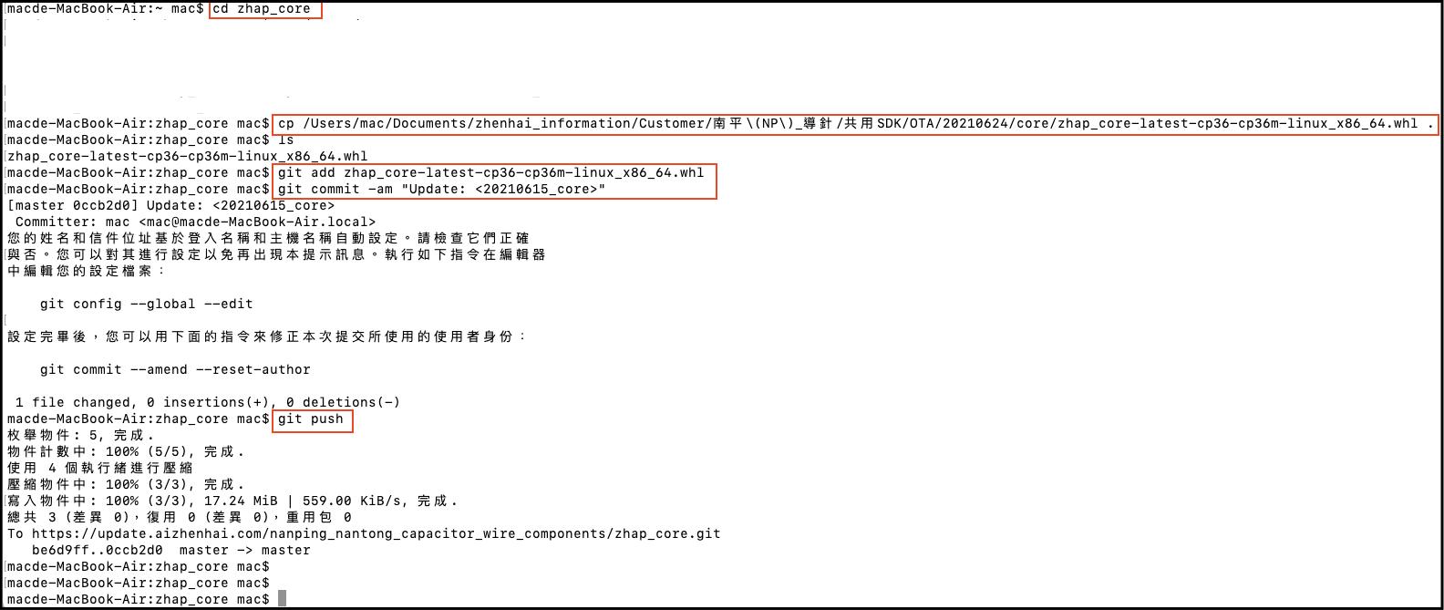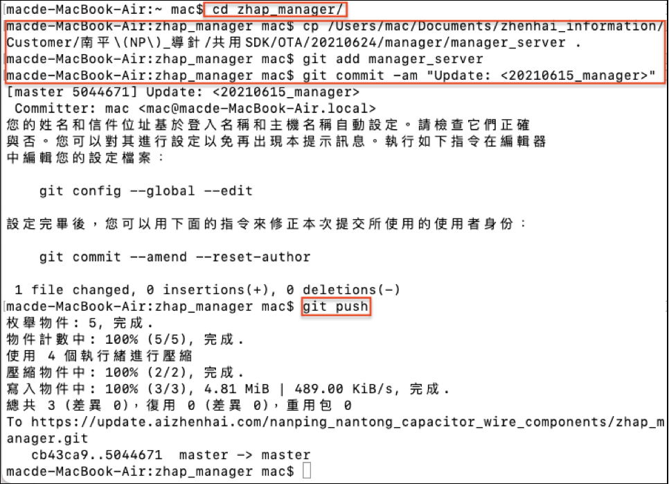 # 使用OTA程序做全廠更新 ## 目的 機台可以通過線上更新,未來只要在將新軟件(core/skin/manager)上傳至OTA Server之後,所有機台只要透過重啟的方式就可以進行軟件更新 ### 第一次執行前準備事項: 請依照本機的系統執行底下操作,確保可以進行操作:# 執行命令前,請先安裝 Git (確保可執行 git 指令) 例: 您的本機若為MacOS > $ brew install git > 例: 您的本機若為Ubuntu > $ sudo apt install git ### A.將新軟件上傳至Server步驟: #### Step1. 在本機上將欲上傳之軟件進行檔名更新: core的軟件原始檔名如下: > zhap_core_nanping_capacitor_wire_components-20xx.xx.xx-cp36-cp36m-linux_x86_64.whl > 請改成 > zhap_core-latest-cp36-cp36m-linux_x86_64.whl skin的軟件原始檔名如下: > setup_skin_general_xxxxxx_no_password.sh > 請改成 > setup_skin_general_latest.sh manager的軟件原始檔名如下: > manager_server > 不用改,仍保持 > manager_server #### Step2.底下分別說明三個軟件如何上傳至Server 2.1 上傳 zhap_core 2.1.1 本機上輸入底下命令: > $ git clone https://<gitlab_ip_domain>/<廠商帳號>/zhap_core.git Ex: > $ git clone https://update.aizhenhai.com/nanping_nantong_capacitor_wire_components/zhap_core.git #### 註: 上面那行如果無法連,可改用下面這行試試 (其它 project 以此類推) > git clone https://<廠商帳號>@<gitlab_ip_domain>/<廠商帳號>/zhap_core.git Ex: > $ git clone https://nanping_nantong_capacitor_wire_components@update.aizhenhai.com/nanping_nantong_capacitor_wire_components/zhap_core.git  完成後如下圖所示.  2.1.2 繼續於本機上輸入底下命令: > $ cd zhap_core #### 註1.上傳 zhap_core-latest-cp36-cp36m-linux_x86_64.whl 檔 (其它檔案、檔名無作用) > $ cp /path/to/zhap_core-latest-cp36-cp36m-linux_x86_64.whl . #### 註2.這裡的/path/to/是指本機存放檔案的路徑 > $ git add zhap_core-latest-cp36-cp36m-linux_x86_64.whl > $ git commit -am "Update: <更新內容隨你打>" #### 註3.更新的內容可以用於網站上做確認是否有上傳成功 > $ git push 完成後如下圖所示.  2.2 上傳zhap_skin 2.2.1 本機上輸入底下命令: > $ git clone https://nanping_nantong_capacitor_wire_components@update.aizhenhai.com/nanping_nantong_capacitor_wire_components/zhap_skin.git  完成後如上圖所示. 2.2.2 繼續於本機上輸入底下命令: > $ cd zhap_skin > $ cp /path/to/setup_skin_general_latest.sh . #### 註1.上傳 setup_skin_general_latest.sh 檔 (其它檔案、檔名無作用) #### 註2.這裡的/path/to/是指本機存放檔案的路徑 > $ git add setup_skin_general_latest.sh > $ git commit -am "Update: <更新內容隨你打>" #### 註3.更新的內容可以用於網站上做確認是否有上傳成功 > $ git push 完成後如下圖所示.  2.3上傳 zhap_manager 2.3.1 本機上輸入底下命令: > $ git clone https://nanping_nantong_capacitor_wire_components@update.aizhenhai.com/nanping_nantong_capacitor_wire_components/zhap_manager.git 完成後如下圖所示.  2.3.2 繼續於本機上輸入底下命令: > $ cd zhap_manager > $ cp /path/to/manager_server . > $ cp /path/to/rec_expiry . #### 註1.上傳 manager_server, rec_expiry 檔 (其它檔名無作用) #### 註2.這裡的/path/to/是指本機存放檔案的路徑 #### 註3.rec_expiry一般來說不會更新,有必要更新會特別提醒 > $ git add manager_server #### manager_server 執行檔 > $ git add rec_expiry #### rec_expiry 執行檔,有更新才需做 > $ git commit -am "Update: <更新內容隨你打>" #### 更新的內容可以用於網站上做確認是否有上傳成功 > $ git push 完成後如下圖所示.  2.4 確認軟件是否均已上傳 2.4.1進入 > https://update.aizhenhai.com/  帳號/密碼請洽相關人員 2.4.2 登入後可以看見3個project表示core/skin/manager,並可以個別點進去看到你剛剛上傳的檔案是否有成功     ### B.如何將機台進行軟件更新: 通常在機台在進行第一次檢測系統安裝時,皆會安裝ota安裝包,請見`“導針檢測系統安裝手冊(離線版本)“`step4,安裝完畢後,在機台的`/opt/zhenhai/ota`路徑下會產生兩個腳本(`ota_client.sh`/`ota_download.sh`) ``` OTA的工作原理是: 每隔兩小時,背景程式便會自動到ota server上查詢是否有最新軟件的存在,若有,則下載最新軟件,並於下次開機時執行該 service 「一次」,就是去做更新的動作. 因此更新時,需要預留一段時間(先等ota_download.sh下載軟件),然後再進行電腦重啟,才會成功更新. ``` 如果要在機器運作時手動進行更新時,則要先下底下命令,先下載ota server上最新軟件 > $ bash ./ota_download.sh 再進行軟件更新的動作 > $ sudo service zhap_ota restart #### C.注意事項: 1.若使用git clone上傳更新軟件失敗,遇到底下問題時: ``` ! [rejected] master -> master (fetch first) error: 推送一些引用到 'https://update.aizhenhai.com/Zhenhai/zhap_core.git' 失敗 提示:因為遠端版本庫包含您本機尚不存在的提交,而導致更新被拒絕。這通常是因為另外 提示:一個版本庫已向該引用進行了推送。再次推送前,您可能需要先整合遠端變更 提示:(如 'git pull ...')。 提示:詳見 'git push --help' 中的 'Note about fast-forwards' 小節。 ``` 解決辦法: 將git clone所產生的zhap_core整個刪掉(ex: /Users/Mac/zhap_core),再重新執行一次 2.若機台重啟時不想執行ota軟件更新,則可以對機台`/opt/zhenhai/ota`底下的腳本改檔名(原始檔名分別為`ota_client.sh`/`ota_download.sh`) Ex: > $ sudo mv ota_client.sh ota_client_off.sh > 完成後如下圖