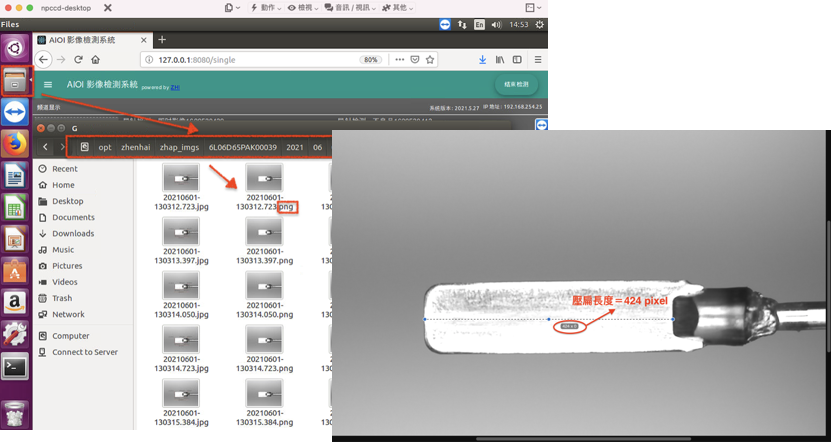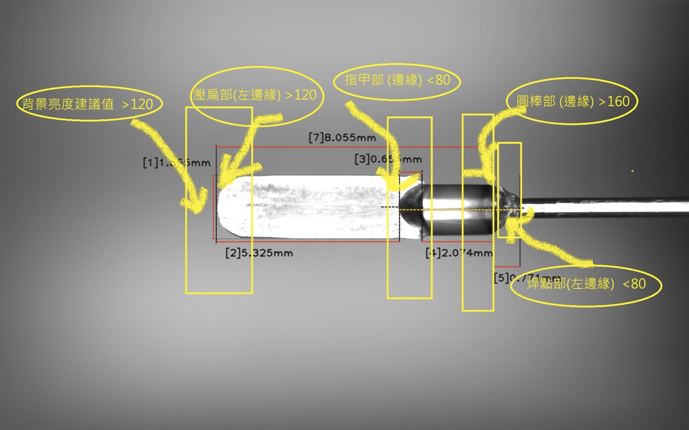 # 導針檢測教育训练项目 ### 1.各项尺寸检测的光学识别原理,利于后期调整光源与检测系统的匹配度 ``` 使用本檢測系統,在調整相機角度、焦距及位置時請注意下項事項: 1. 照片成像必須清晰不模糊。 2. 導線棒於照片內容中呈水平,傾斜最高不得超過5度。 3. 導針各部位光源的亮度請遵循下圖規範,不得差異過大。 4. 請善用頻道設定頁面“匯出頻道設定”功能,若每一規格的導針均有一份自己的設定檔, 未來改規格時,只需匯入並套用對應的設定檔即可,如必要時微調長度換算(1px =?mm), 可以省下重新設定的時間。 ```  ### 2.各项检测系统中改良功能的识别改善原理及应用时机 ``` 若在硬件已調整到位(相機角度、焦距及位置)或者導針本身的存有的問題(燻黑)無法克服的情況下, 檢測的結果仍有標線不準的現象時,頻道設定中提供了的幾個改良參數, 使用者可依據狀況並對照底下的使用時機來判斷是否符合開啟的條件,由於各機台導針尺寸 都不一樣,因此在做改良參數開啟測試時,能多加以觀察驗證。 ``` | 參數名稱 | 使用時機 | 缺省值 | | -------- | -------- | -------- | | 開啟水平校正 | 避免當導針傾斜而且機台無法克服時導致的誤判,|啟用| ||如必要才關閉。 || | 指甲部左輪廓形狀 | 設定指甲部左邊的形狀,以利演算法最佳化。 | 圓形 | | 指甲部右輪廓形狀 | 設定指甲部右邊的形狀,以利演算法最佳化。 | 圓形 | | 改良圓棒部檢測 | 是否啟用圓棒焊點檢測改良算法,如必要才開啟。 | 關閉 | | 補正壓扁部左邊緣 |壓扁部左邊緣成像破孔或陰影嚴重,且機台無法克服時才使用,| 關閉 | ||如必要才開啟。| | | 補正指甲部左邊緣 |指甲部左邊緣成像不均勻且機台無法克服時才使用,|關閉| ||如必要才開啟。| | | 補正圓棒部右邊緣 |圓棒部右邊緣成像燻黑嚴重導致亮度有明顯斷層| 關閉 | ||(左端亮,右端暗)且機台無法克服時才使用,如必要才開啟。|| | 補正焊點部右邊緣 |焊點部右邊緣成像不均勻且機台無法克服時才使用,|關閉| ||如必要才開啟。| | | 補正壓扁部上下邊緣|壓扁部上下邊緣成像或陰影不均勻且機台無法克服時才使用,| 關閉 | ||如必要才開啟。| | | 補正圓棒部左邊緣 |當指甲部與圓棒部分界不明顯或成像陰影不均勻且機台| 關閉 | ||無法克服時才使用,如必要才開啟。| | > 註1:以上各參數如有必要才開啟。 > 註2:使用補正壓扁部/指甲部/圓棒部/焊點部參數時,由於這些參數均與對應的容許值有正相關聯,以利該檢測項目演算法的最佳化,因此其容許值不能為0,若該容許值為0,建議可以調整基準值並適時的給予容許值,以符合檢測規範。 ### 3.如何快速检验CCD软件功能完整性(自检) ``` 可以依據底下狀況判定: 1.電腦開機後,檢測程式頁面將自動開啟。 2.機台生產時,檢測程式開始進行檢測。 3.機台停止生產時,檢測畫面將停止在最後生產的畫面,檢測系統上顯示的時間將停止。 4.當按下結束檢測時,檢測程式將停止檢測,但檢測畫面會隨著機台生產而移動, 檢測系統上顯示的時間則顯示當時時間。 ``` ### 4.客户改规格时,检测系统的内各项参数如何更改 ``` 客戶在改規格時,應遵守下列幾點: 1.首先建議先使用匯出頻道設定功能,將舊有的規格文檔先存檔匯出,以利未來換回時可以直接套用。 2.請確認成像的質量,必須清晰不模糊,還有各部位的光源條件均須符合建議值,詳細請見"導針檢測 教育训练项目1"。 3.確認px值正確,因為在改規時,理論上相機與導針的工作距離不會有太大的變動,但還是會有細微的差距, 因此需要透過微調px值來降低不良率,至於如何調整px值,請參考如下敘述,亦可參考操作說明書。 4.當發現標線不準時,除了確認上述步驟有無問題之外,還需根據標線不良的部位,適時的開啟或關閉改良 檢測,詳細請見"導針檢測教育训练项目2"。 5.若改規格的導針,是檢測系統先前未曾檢測過的,則可能會有誤判或未知圖資的發生, 若不管是硬件調整或者改良檢測開關都沒有明顯的效果的話,就需要緊急告知振海進行軟件的更新。 ``` #### 如何測得長度換算(1px= ? mm)值: ``` 拍照後請於底下路徑 (/opt/zhenhai/zhap_imgs/相機序號/yyyy/mm/dd/hh/G), 挑選一張原圖(.png),使用一般繪圖軟件開啟,即可使用鼠標標記各部位長度, 並顯示其pixel值,再將基準尺寸(實際尺寸)除以其pixel值,即可得到長度換算(1px= ? mm)值。 ``` > 註:開啟原圖的繪圖軟件可能依使用者有所不同,無支援顯示pixel值。  ### 5.未知图片产生的原因及快速解决办法 ``` 若是發生在改規格時,請參考"導針檢測教育训练项目4"。 若是發生在既有規格且是突然大量未知圖片產生時,請確認底下幾點: 1.檢查硬件機構是否有被改變,導致成像有變化,例如圖資某個角落有不明異物。 2.光源是否有明顯的變化,請重新確認光源,請參考"導針檢測教育训练项目1"。 3.頻道設定有被不正常的修改,例如某個檢測設定的基準值與導針實際值差異甚大。 ``` ### 6.30万相素相机和200万像素相机检测耗时计算分析估算,便利机台不同生产速度的相机快速选型 > 目前這兩種畫素相機在檢測速度上,皆可以應付機台的生產速度,但仍建議先以小畫素相機為優先,然後最終再根據實際拍攝場景的需要來計算精度。 ``` 底下介紹光學應用上的基本公式 1.FOV(視野範圍)的計算方式可以參考如下: FOV=(sensor size* 工作距離)/焦距 EX: 以目前實際使用30萬畫素華睿相機的話 (