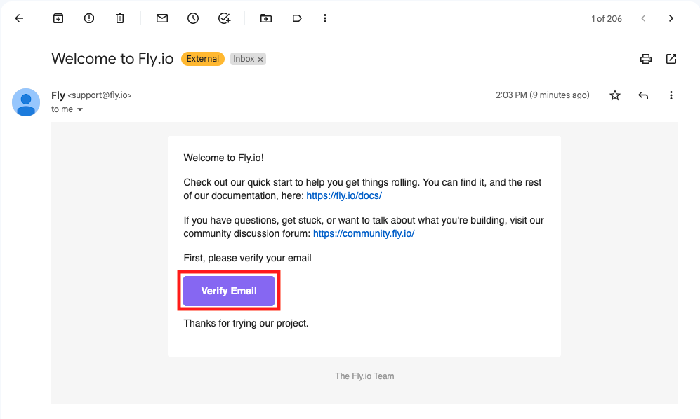 4. Once you are done signing up, you'll receive an **email** asking you **to verify** your new Fly.io account. **Click on the verification link** inside the email to complete the sign-up process.