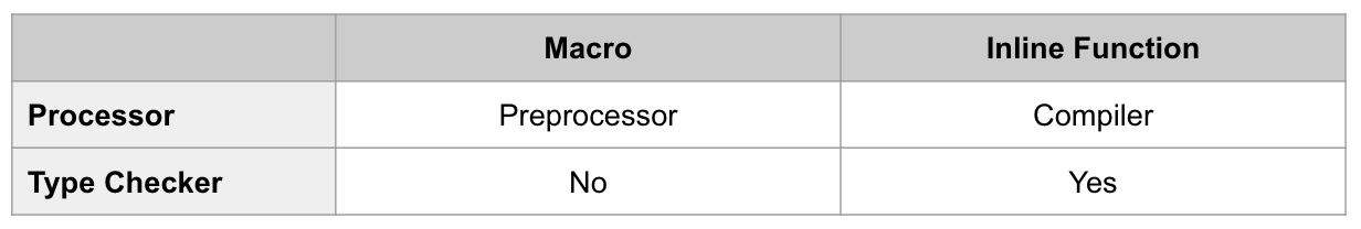 inline function可建議compiler嵌入函式,能節省function呼叫的時間,但若函式包含遞迴或是內容龐大,則compiler會忽略inline請求。