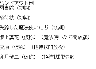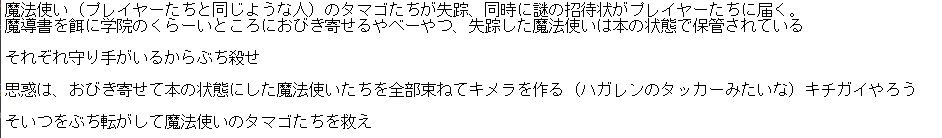 # TRPGシナリオ錬成講座 注意書き:以下の記事からは何一つ学術的な知見は得られません。質問もポスター資料の要求も受け付けません。たまには狂わせろ おはようございます、Tommiでございます。今日はTRPGのシナリオについてお話しようかなと思ってます。 結論から言うと、**みんなTRPGシナリオ作ろうぜ、そしてたまには俺にGM(TRPGの司会進行を務める側。ゲームで言うコンピュータ側)じゃなくてプレイヤーをさせてくれ**という内容になりますが、TRPGだけでなく、ストーリーが含まれるもの全般に対して使える知見ではあると思うのでもしよかったら読んでみてください。 ## ときは遡り4年前。 アドカレでTRPGについて迷文を錬成した覚えがあるくらいにはTRPGにハマっておりました。今こそそんなにやってはいませんが、後輩同輩先輩に布教したりする中で、少しずつTRPGをするだけでなく、企画(?)する側になり始めてきました。 すると何が起きるかと言うと、圧倒的に手元に**シナリオ(どのような世界観でプレイヤーたちが何をやるのか記した文書。普通のゲームで言うゲームソフトのようなもの)不足**になるわけです。もちろんTRPG即売会やオンラインで買ってくることもできるわけですが、自分で作ることにも楽しみがあります。 主に… ・性癖をぶっこんだキャラクターや演出、音楽などが細部までカスタマイズ可 ・世界観の深め ・創作自体がシンプルに楽しい 良いシナリオを作れれば、企画する方も、遊ぶ方もきっと楽しいひとときを過ごせるでしょう。 今回の記事では、私が思うシナリオの作り方を実際に一つ骨組みレベルのものを作りながら伝えられたら良いなと思ってます。 ## ざっと必要な材料 ### やりたいこと・テーマ だいたいこれが無いとスッカスカのシナリオになりがちです。やりたいシーンや演出したい世界観、TRPGシステムの中でやってほしい事(1d100のSANチェックとかもここに入ります)とかから考えると良いですね。 特にここで持っておくと強いのは、あらかた決まった世界観や登場キャラクターのセットです。そういうのをベースにするだけでうんと作業量が減り、GMをする際も気にする負担が減ります。例えば… **・好きなアニメ・漫画・ゲーム・ソシャゲイベント** 好きなキャラ、セリフが使いたい放題。キャラの性格もプロフェッショナルが作っているものなのでスベることはまずない。世界観も同様。同じ作品を知っているプレイヤーを前提にするならなおさら伝える量が減って楽です(○○をイメージしてください!で伝わるのがとても良い)。メディアそのまま使う場合は著作権に気をつけてね。 もちろん、複数のメディアのアイデアをあわせてキメラのような世界観を作るのもありです。そうしていくうちに結局は「どこかで見たことのあるような」設定の寄せ集めだけど、オリジナルさがある、という世界観が出来上がるところが良いです。美味しい。 **・夢** 意外と馬鹿にならない。あれってたまに起承転結のうちの起承転くらいまで再現してくれるので、それをベースに物語を書くとなると、オチを考えるだけでほぼ完成に近づきます。とても強い。 **・公式ルールブック** TRPGを本格的にやるなら必需品。公式ルールブックには意外とたくさん世界観について語られていることが多いです。「クトゥルフの呼び声TRPG」では、ラブクラフト本人が著した小説が数万字書かれていますし、そうじゃなくても「魔導書対戦マギカロギア」「DX3rd」などの日本製のシステム(戦闘や探索、世界観などのセット。ゲームでいうエンジンとかシリーズIPとか)でもよく見かけます(何ならそっちのほうがたくさん書かれてる。作っているひとも狂ったオタクなので)。今でも3,4年かけて読みこんだシステムから面白そうな世界観や設定が発掘されることもありますし、それがシナリオフック(シナリオのアイデア。種のようなもの)になります。 今回は「マギカロギア」の公式ルールブックから「学院」を舞台に、最近嗜んでいるゲーム「Library of Ruina」の図書館の感じを融合させる感じで作ろうと思っています。  ### システムのルールへの理解 当然ながら、TRPGシナリオを錬成するとなると、ある程度のそのシステムの理解が必要です。3~4回も遊べばなんとなく遊び方は理解すると思っているので、個人的にはそれくらいの経験値からやりたいことがあったらそのフックを育て始めるのが良いかなって思ってます。 ### 狂気 シナリオを一つ作り上げる(もちろん創作全般に対して言えることですが)ことは並ならない熱意が必要だと思ってます。実現させたいと思うほどの狂気があるとないとでは大きく変わります。 ## 錬成、いってみよー! 基本的に順序とかはありません。上述の「やりたいこと」から足りない部分を埋めていく感じです。以下は私が確認している順番で書き綴っていきます。 ### 起承転結の徹底 大体これが大事。「何が起点で」「どのようにストーリーが解かれて」「どうやってクライマックスまで