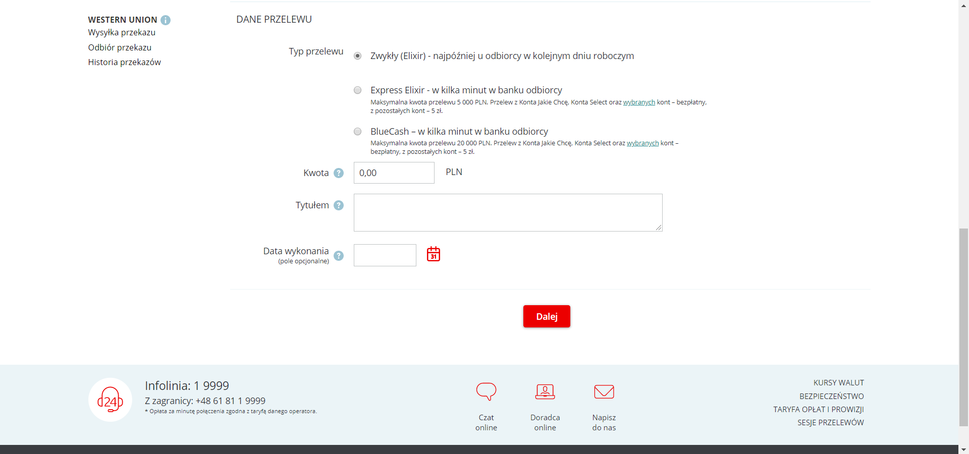 Wszystkie pola do wypełnienia w przelewie są odpowiednio opisane, tak że wiemy jaka jest ich funkcja. Dodatkowo możemy kliknąć na znaki zapytania, jeżeli potrzebujemy dłuższego wyjaśnienia. Po wypełnieniu wszystkich wymaganych pól i wciśnięciu "Dalej", zostaniemy poproszeni o potwierdzenie przelewu poprzez wpisane kodu SMS wysłanego na nasz telefon, kończąc tym samym cały proces.