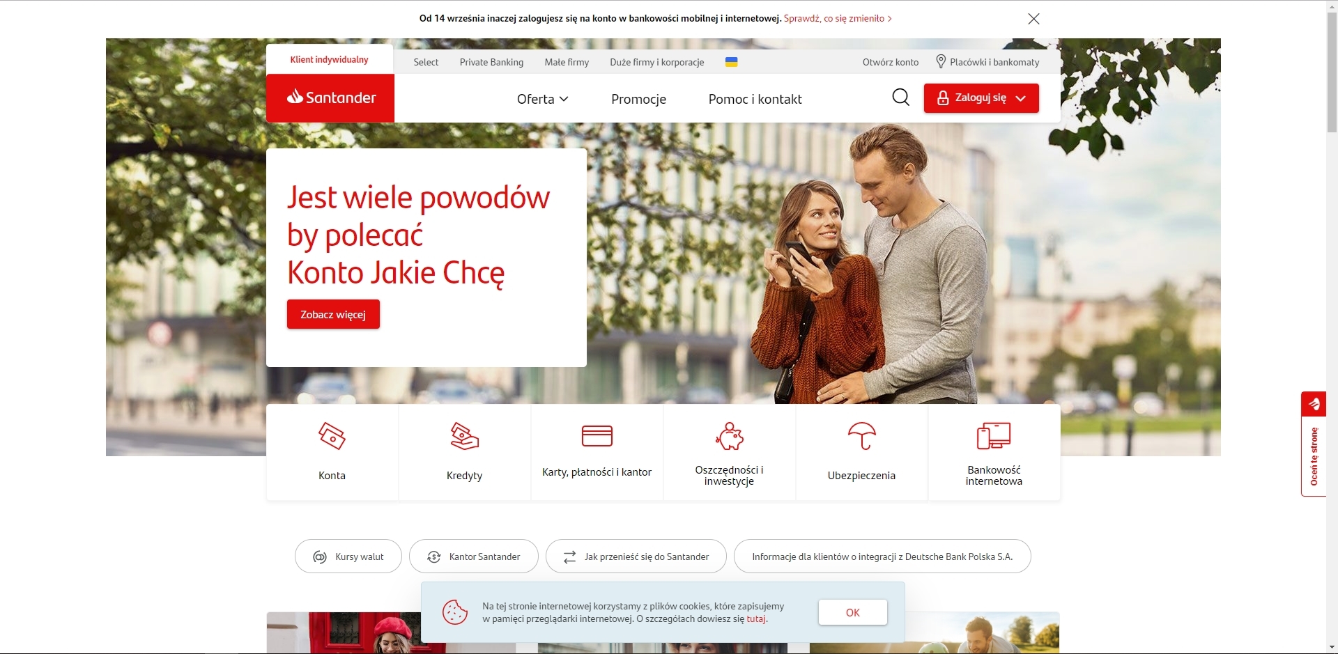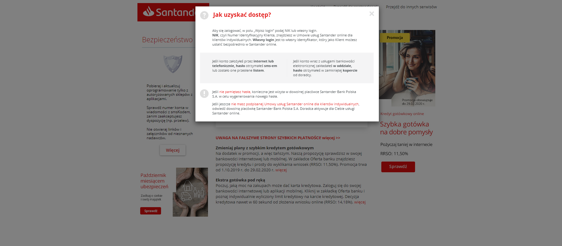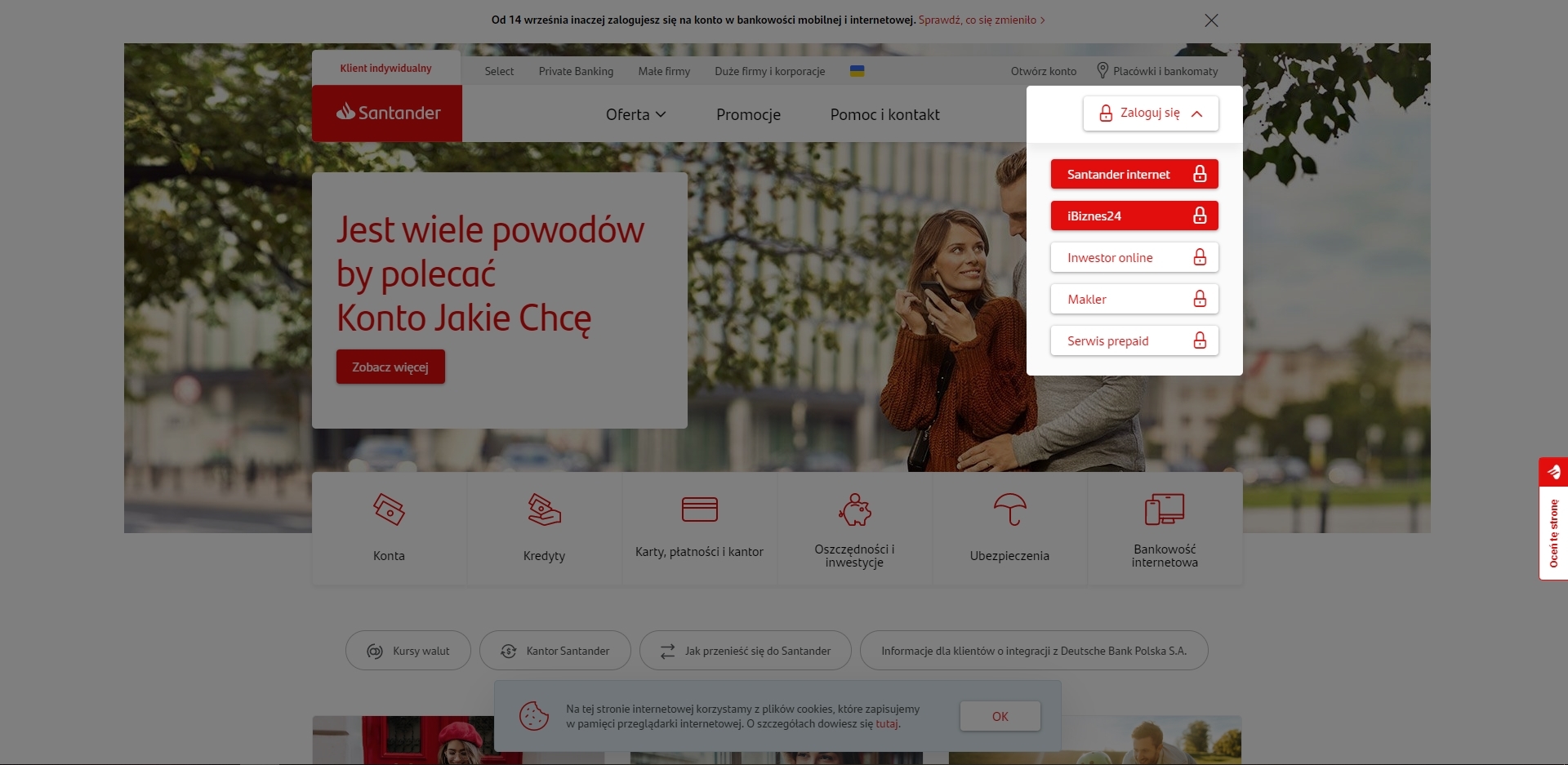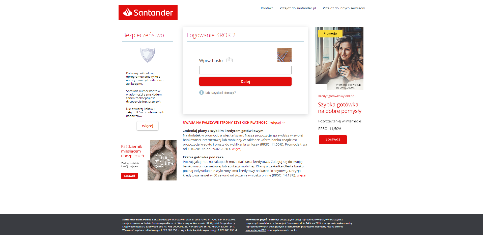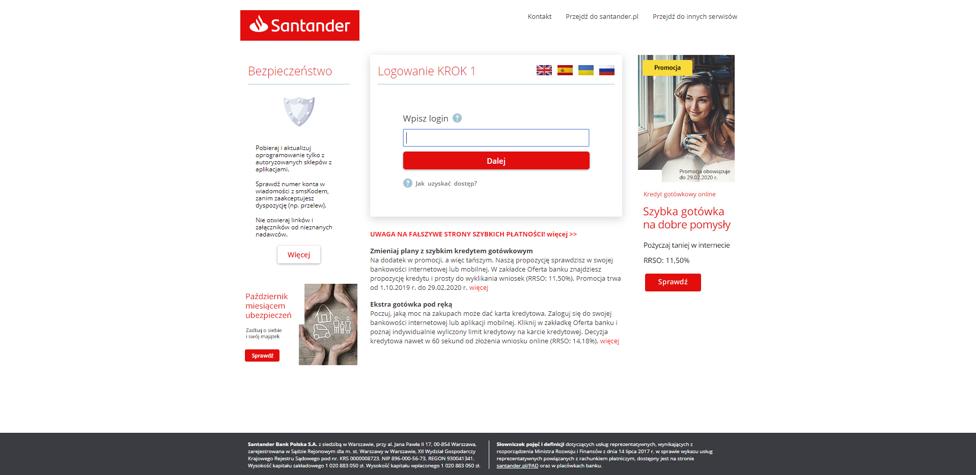 Po wejściu na stronę Santander.pl ukazuję nam się przedstawiony powyżej ekran, przycisk "zaloguj się" jest dosyć dobrze widoczny, jednak byłoby lepiej, gdyby był podpisany np. "Zaloguj się do banku". Czy to wszystko by dostać się do ekranu logowania?