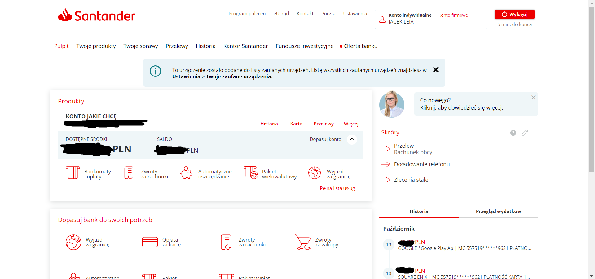 Wracając do strony głównej, pod głównymi informacjami mamy przedstawioną niedawną historię rachunku.