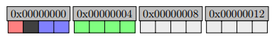 3個不同的顏色分別代表一筆 char, short, int 資料,當要讀取 int 時,就必須讀取兩個 word,經過 shift 後才能得到正確的資料