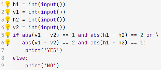 Шаховий король ходить по горизонталі, вертикалі та діагоналі, але тільки на 1 клітинку. Дано дві різні клітини шахівниці, визначте, чи може король потрапити з першої клітини на другу одним ходом. Програма отримує на вхід чотири числа від 1 до 8 кожне, що задають номер стовпця і рядок спочатку для першої клітини, потім для другої клітини. Програма повинна вивести `YES`, якщо з першої клітини ходом короля можна потрапити в другу або `NO` в іншому випадку.
