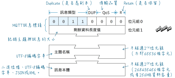 **MQTT** ===  ## MQTT 協定 * (中文版) http://mcxiaoke.github.io/mqtt/protocol/MQTT-3.1.1-CN.html#pf2d * (英文版) http://docs.oasis-open.org/mqtt/mqtt/v3.1.1/os/mqtt-v3.1.1-os.pdf ## Mqtt 教學 * 付費的 MQTT 服務廠商的文件 (寫最完整) [MQTT 教學](https://www.hivemq.com/blog/mqtt-essentials/) 1. [Part 2 中文版](https://coyee.com/article/11999-mqtt-essentials-part-2-publish-subscribe) 1. [Part 3 中文版](https://coyee.com/article/12000-mqtt-essentials-part-3-client-broker-and-connection-establishment) 2. [Part 4 中文版](https://coyee.com/article/12008-mqtt-essentials-part-4-mqtt-publish-subscribe-unsubscribe) 3. [Part 5 中文版](https://coyee.com/article/12006-mqtt-essentials-part-5-mqtt-topics-best-practices) 4. [MQTT Essentials Special 中文版](https://coyee.com/article/12006-mqtt-essentials-part-5-mqtt-topics-best-practices) [MQTT 安全](https://www.hivemq.com/blog/mqtt-security-fundamentals/) * 簡中,寫得很完整 [MQTT教學](http://www.iteye.com/blogs/subjects/mqtt ) * 寫得不錯,而且又是中文 (基礎介紹) [MQTT教學(一)](https://swf.com.tw/?p=1002) [MQTT教學(二)](https://swf.com.tw/?p=1009) ## MQTT 版本 (MQTT 5 還未更新)  ## MQTT 與 HTTP 訊息內容比較  * HTTP 訊息內容 * MQTT 訊息內容  ## 運作流程  ## Topic (主題) * Topic (主題) 結構範例  * Topic (主題)命名規則 :::info 1.階層名稱可以空白,像這樣的命名 home//yard,代表有三個階層,中間階層沒有名字 2.長度不可超過216位元組(65536個字元)  範例 : 人體感測器1 的 Topic (主題) 命名為  ::: :::danger 非法命名 1.勿用$開頭,Server 通常會使用 $ 開頭主題為統計訊息 2.不可包含#和+字元 ::: ## 訂閱 * Topic (主題)結構範例  * 訂閱 Topic (主題) 規則 ::: info 1.+字元:匹配單一階層的主題名稱 2.#字元:匹配多層主題名稱,這個字元只放在名稱最後。  ::: :::danger 非法訂閱  ::: ## Qos (傳輸品質) ### Qos 0 **只發送一次 (不保證送達)**  ### Qos 1 **保證送達至少一次,所以有可能發送 2 次**  ### Qos 2 **保證送達一次**  ## 程式運作流程 ### 連線 Server 參數 * **ClientID** 客戶端 ID ::: danger 同時只能存一個在 Server 上。 如果用同個 ClientID 連線 Server,Server 會將使用同個 ClientID 的客戶端斷線。 ::: * **UserName** 用於認證的使用者名稱 (Server 需起用認證) * **Password** 用於認證的密碼 (Server 需起用認證) * **CleanSession** 是否清除 Session ::: info Session 包含 1. ClientID 訂閱的 Topic (主題) 2. ClientID 未接收的訊息 ::: :::warning 設定為 True 1. 會清除舊有 Session,重新建立新的 Session 2. 斷線時會清除 Session ::: * **KeepAlivePeriod** Server 在設定的時間內未收到客戶端的訊息時,會將客戶端斷線。 單位 : 秒 ::: info Server 通常會在乘上一個倍數。 EMQ為 【設定的值】* 【0.75 (config 設定)】*【2】 ::: * **WillFlag** 是否起用當斷線時,Server 會發佈 Will (遺囑) 訊息 ::: danger 設定為 False 1. WillRetain、WillQos 必須設定為 0 2. WillTopic、WillMessage 不能有值 ::: * **WillRetain** Will (遺囑) 訊息是否設定為 Retain (保留) 訊息 :::info Retain (保留) 訊息 1. 一個主題只會存在一個 Retain (保留) 訊息 2. 新訂閱的 ClientID 才會收到 Retain (保留) 訊息 ::: * **WillQos** Will (遺囑) 訊息的 Qos * **WillTopic** Will (遺囑) 訊息的 Topic (主題) * **WillPayload** Will (遺囑) 訊息的內容 ### 訂閱參數 * Topics 可同時訂閱多個 Topic (主題) * Qos 設定每個訂閱 Topic (主題) 的 Qos :::warning Server 會依照【訂閱 Qos】和【發佈訊息 Qos】最低的 Qos 做發送訊息 ::: ### 發佈參數 * Topic 發佈訊息到哪個 Topic (主題) * Payload 訊息內容 * Qos 發佈訊息的 Qos * Retain (保留) 訊息 :::info Retain (保留) 訊息 1. 一個主題只會存在一個 Retain (保留) 訊息 2. 新訂閱的 ClientID 才會收到 Retain (保留) 訊息 ::: MQTT Server 比較 === * 網友提供的檔案 (2018 更新) <i class="fa fa-folder"></i> X:\\!Yumin\Demo 程式\Mqtt (使用 EMQ)\Feature.comparison.of.different.MQTT.brokers.pdf * 好像停止更新了,但是還是可以參考 https://github.com/mqtt/mqtt.github.io/wiki/server-support#capabilities .NET 開發 === * **Nuget** 1. Plt.M2Mqtt 2. M2MqttDotnetCore (NET Standard 2.0) :::danger 原版 M2Mqtt 作者已不更新 , 轉移到上面兩個繼續維護 ::: .NET Demo 專案 === <i class="fa fa-folder"></i> X:\\!Yumin\Demo 程式\Mqtt (使用 EMQ) Tag === ###### tags: `Queue`,`MQTT`