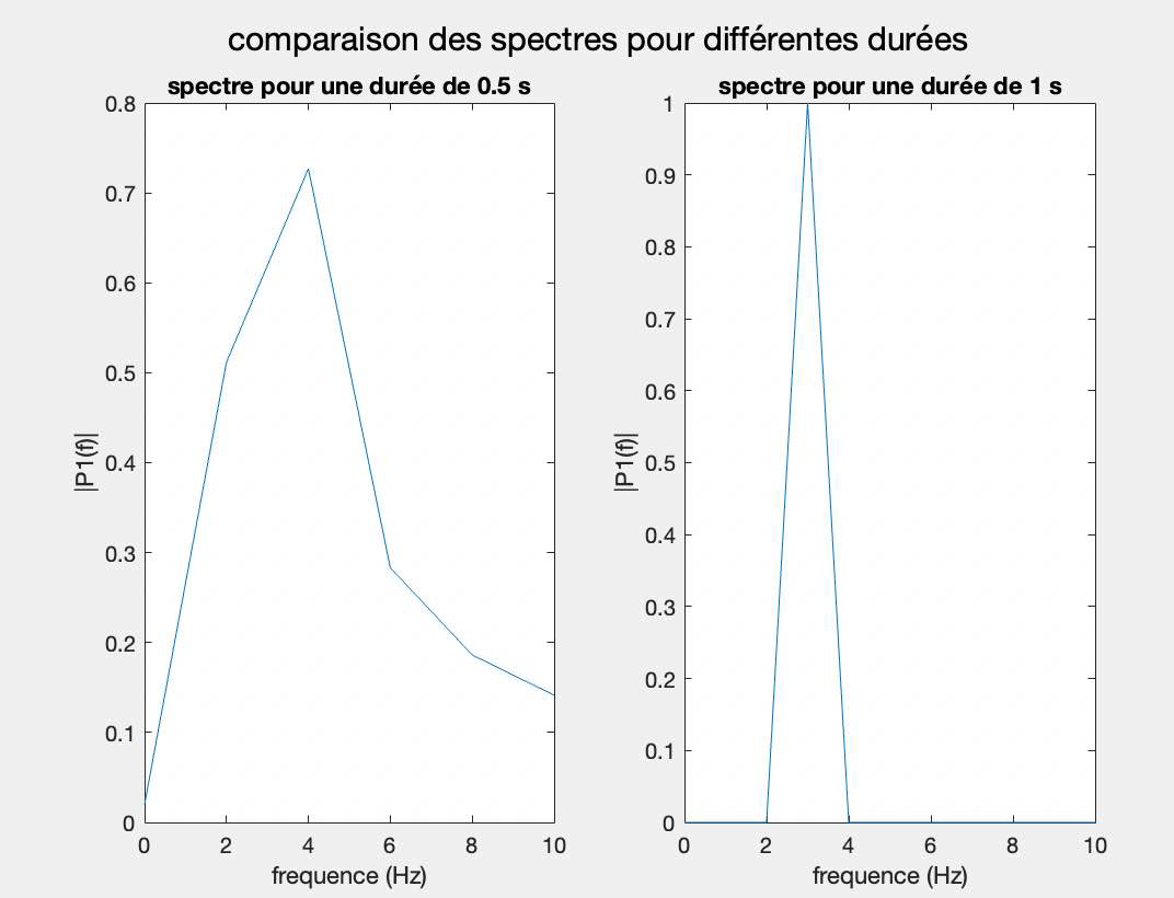 Lorsque la durée du signal passe de 0,5 seconde à 1 seconde, le pic spectral devient plus étroit et plus défini. Cela est dû à une meilleure résolution dans le domaine fréquentiel.En, effet une fenêtre temporelle plus longue permet une détection plus précise des composants fréquentiels.