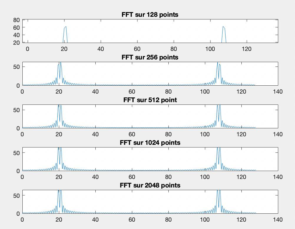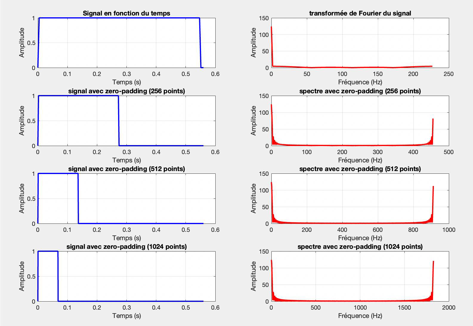 Les graphiques suivants présentent l'effet du zero-padding. Avec 256 points de zero-padding, la résolution en fréquence s'améliore, permettant une distinction plus nette des composantes fréquentielles. Avec 512 points de zero-padding, le spectre devient encore plus détaillé. Enfin, avec 1024 points de zero-padding, la résolution de fréquence est très précise, offrant une visualisation détaillée des composantes fréquentielles du signal. Dans tous les cas, la forme temporelle du signal reste inchangée, mais l'échelle temporelle est étendue pour inclure plus de points.