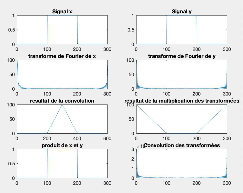 La convolution de \( x \) et \( y \) donne le résultat attendu. La forme triangulaire obtenue est caractéristique de la convolution de deux fonctions porte. La multiplication des transformées de Fourier \( X \) et \( Y \) suivie d'une transformée de Fourier inverse produit également une forme triangulaire. Ceci est cohérent avec le théorème de Plancherel. La multiplication des signaux \( x \) et \( y \) donne une fonction porte, car les deux signaux sont identiques. Cependant, pour la convolution des transformées de Fourier \( X \) et \( Y \) suivie d'une transformée de Fourier inverse, la convolution des transformées de Fourier et la transformée de Fourier inverse donnent une fonction qui représente la multiplication des signaux \( x \) et \( y \) dans le domaine temporel, ce qui confirme la deuxième partie du théorème de Plancherel.