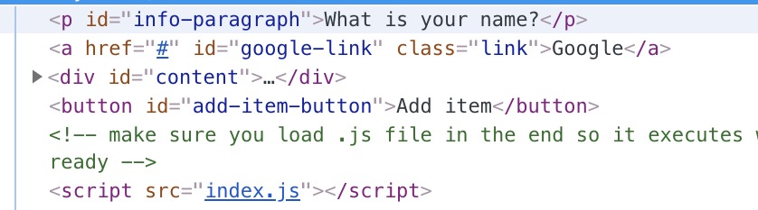 :memo: Create folder `dom-manipulation` and inside, create files `index.html` and `index.js`. Copy the code below in the `index.html`: