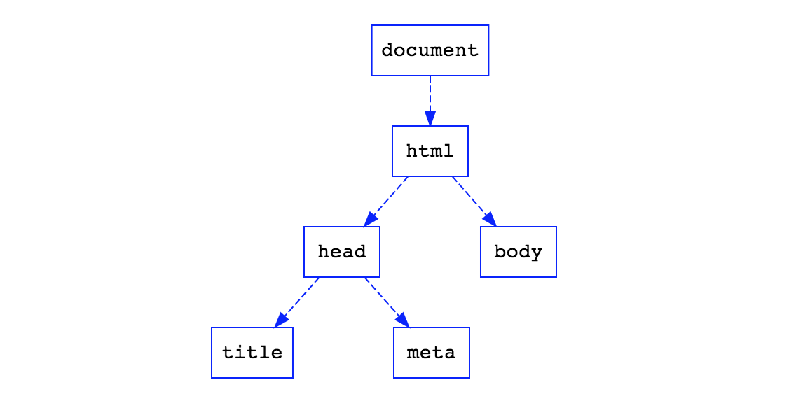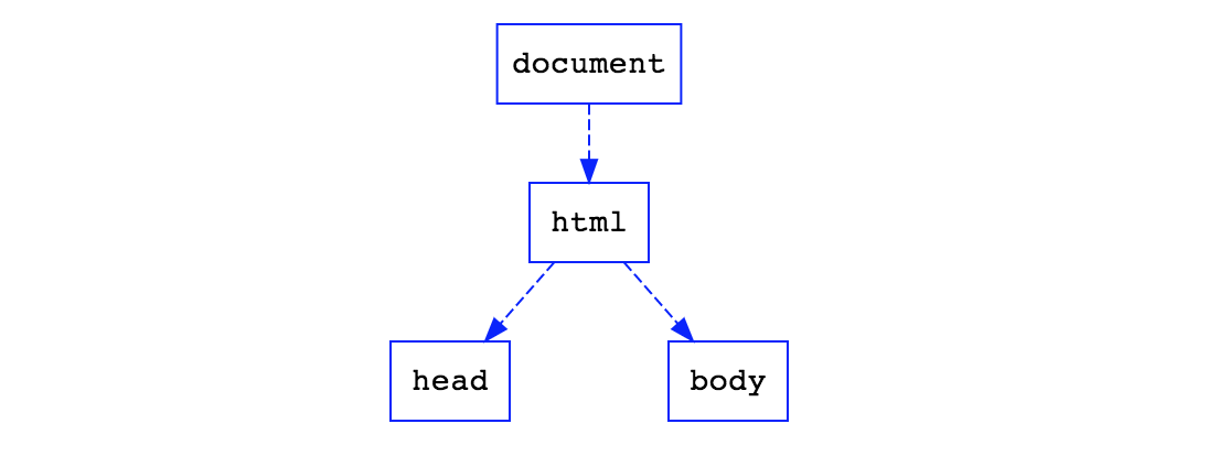 The DOM structure is usually represented as a tree of nodes, where we can see what nodes (such as `<html>`) have which other nodes inside, for example `<head>`.