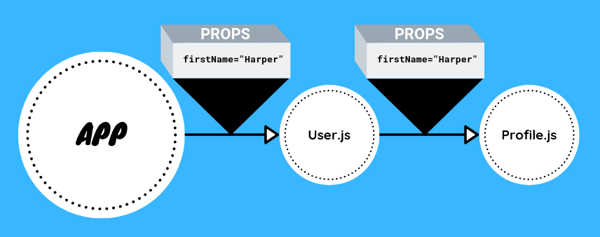 The `App` component can share information with its child `User` and `User` can also share information with its potential children and so forth.