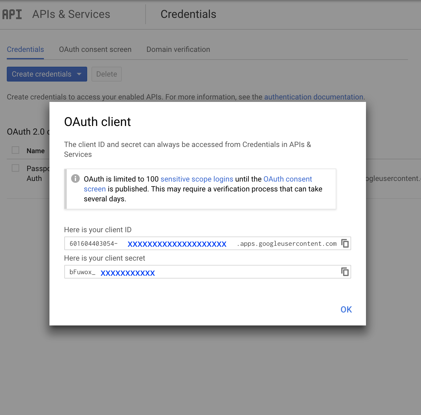 After clicking **Ok**, you will get redirected to the *Credentials* page where you will see the name of your app when it was created and your Client ID. In case you lose your credentials, you can always come back and recreate them by clicking on *Create credentials* button in the upper left corner of the page.