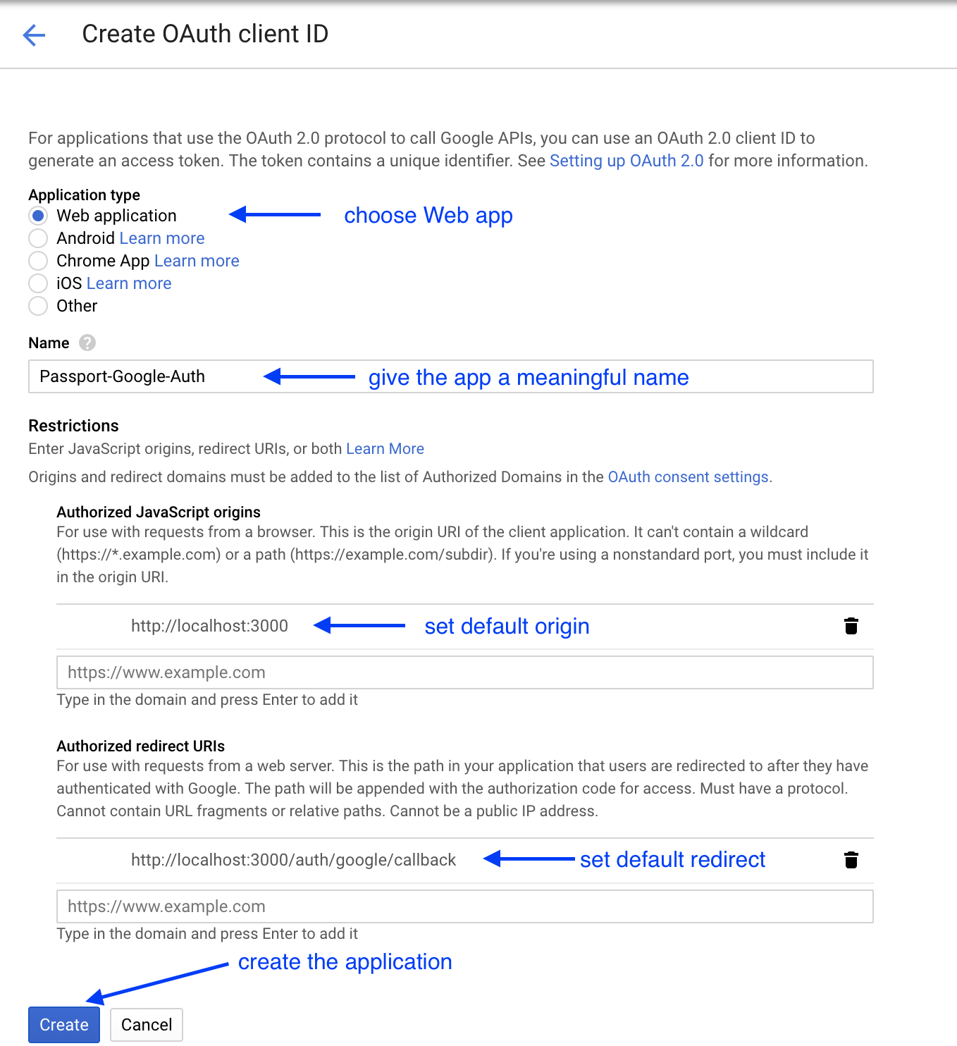 3. You will be redirected to the *Create OAuth client ID* page and given to choose what kind of application you are building. Pick **Web application**. An additional form will open. Follow the given instructions in the image below: