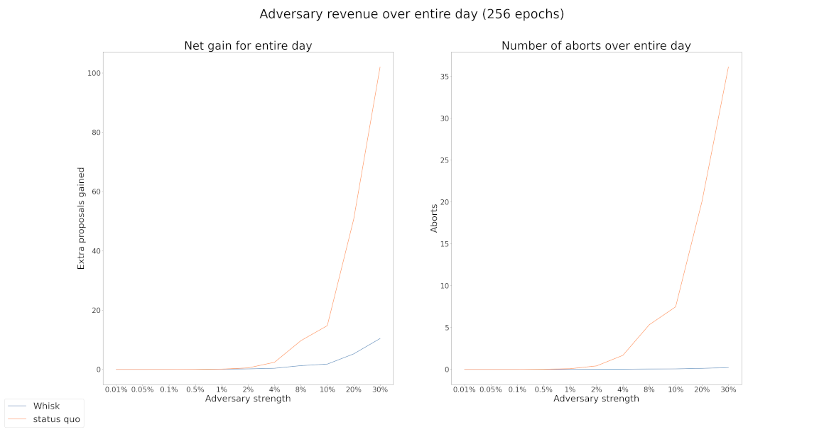 By comparing Whisk with the status quo, we found that while big adversaries can extract bigger profits in the status quo, Whisk allows even small adversaries to extract profits by attacking RANDAO once per day. Please see [the Appendix](#Appendix-B-RANDAO-attacks) for more details on the results.