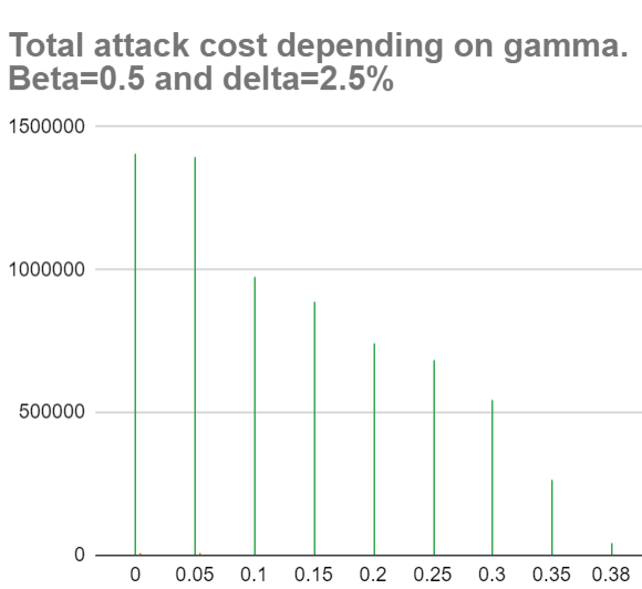 An attacker who controls 50% of the network ($\beta=0.5$) and wishes to shut down 2.5% of the network ($\delta=0.025$). His cost depending on $\gamma$ is high up to $\gamma=0.15$ and then drops: