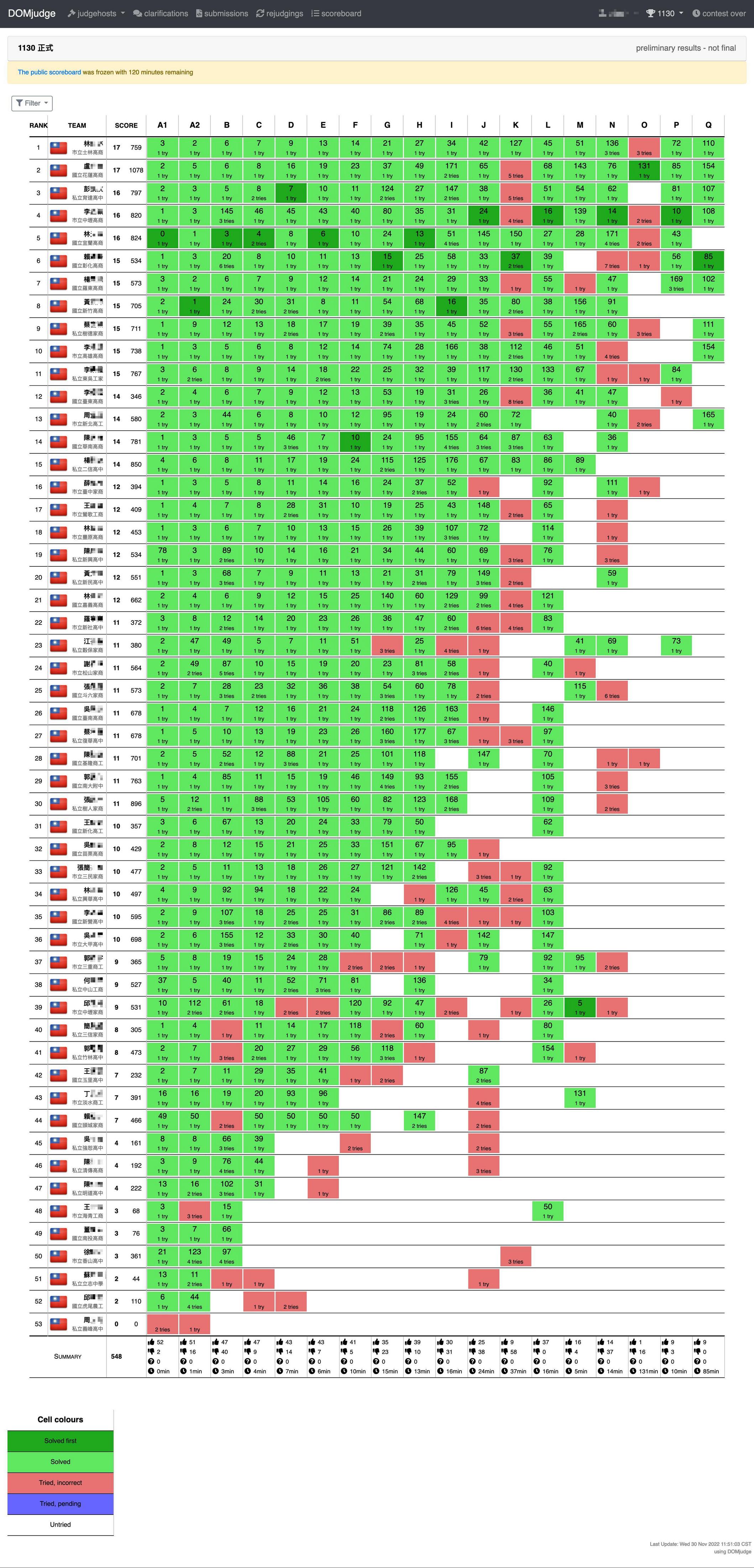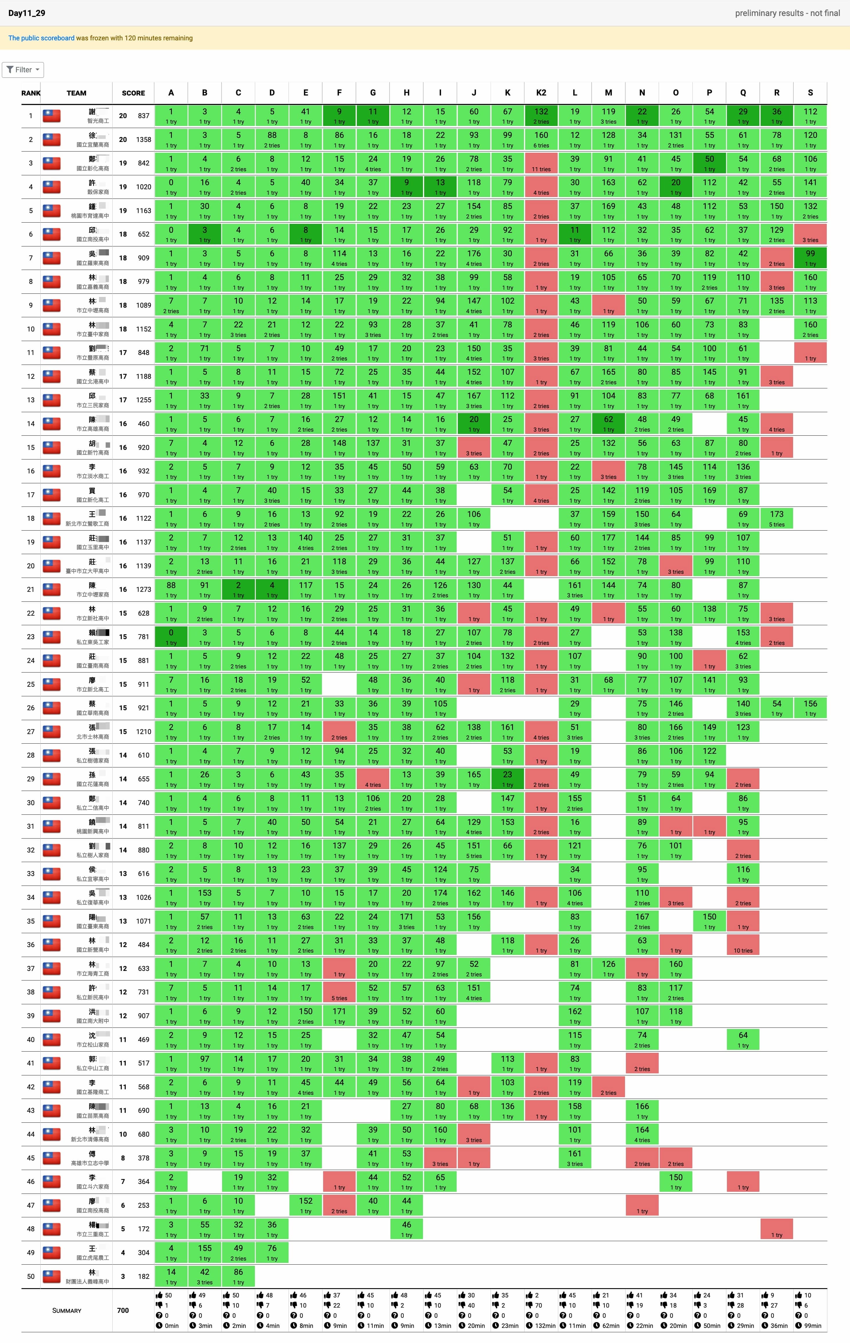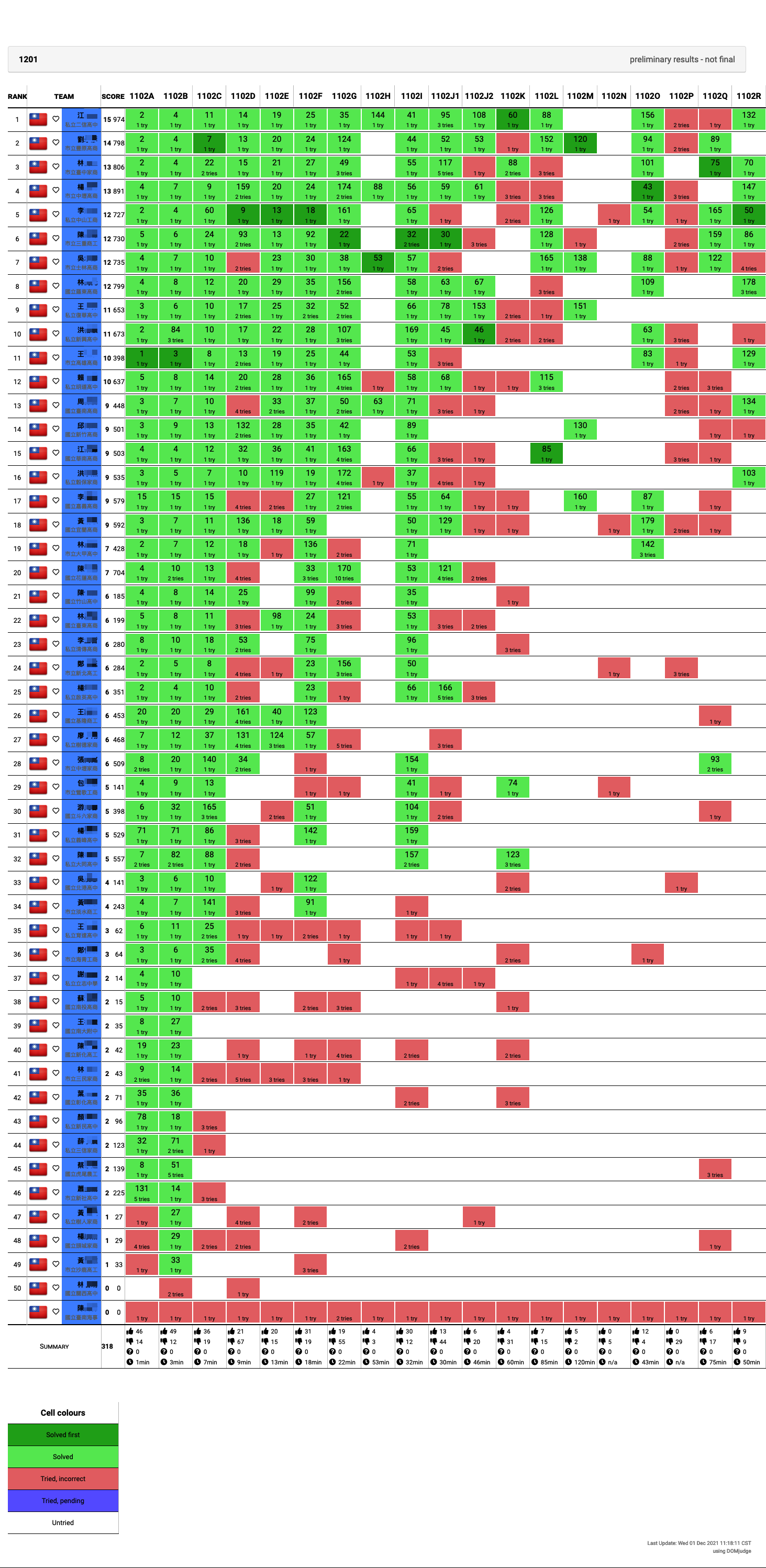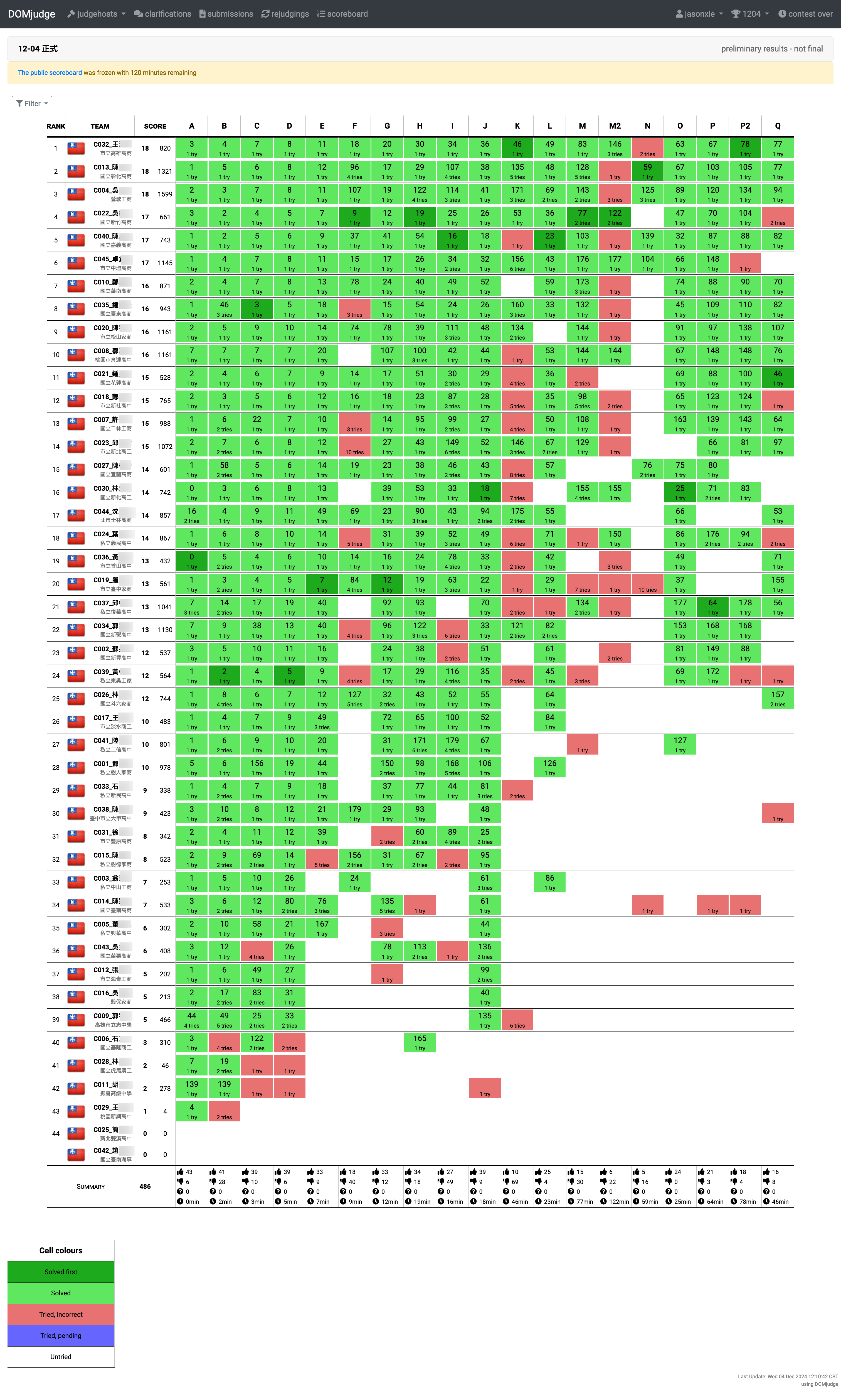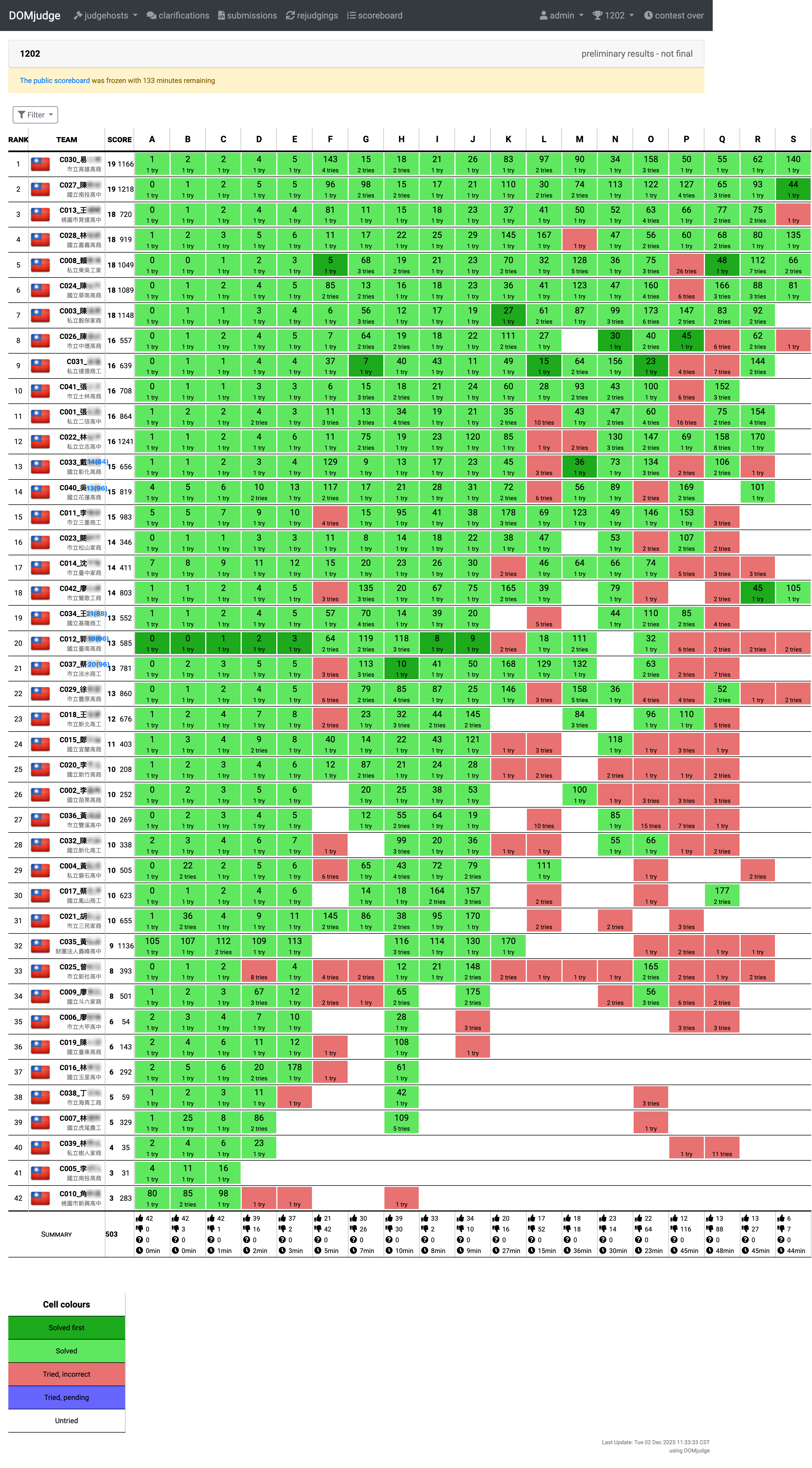 # 計分版公告 ## [比賽規則](https://hackmd.io/@biz-pg/rule) ## 114 學年度(臺南高商) 12/02  ## 113 學年度(基隆商工) 12/04  ## 112 學年度(高雄高商) 11/29  ## 111 學年度(三重商工)  <!--  --> ## 110 學年度(彰化高商)  <!--  --> Judge 裁判機網址: https://zerojudge.ntub.tw/ 帳號申請表單 https://domjudge-simple-signup.streamlit.app/ [線上評分說明文件網址](https://hackmd.io/@biz-pg/announce) [學生端開發環境 VM](https://hackmd.io/@biz-pg/client-vm) [學生端使用手冊](https://hackmd.io/@biz-pg/student-doc) [推薦的 IDE](https://hackmd.io/@biz-pg/ide)