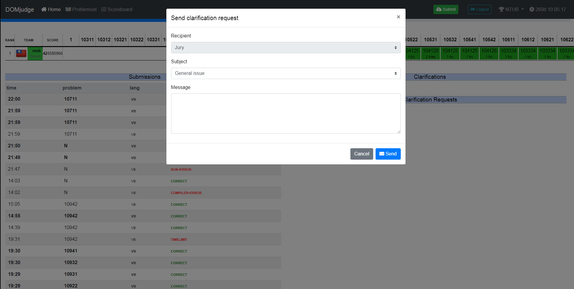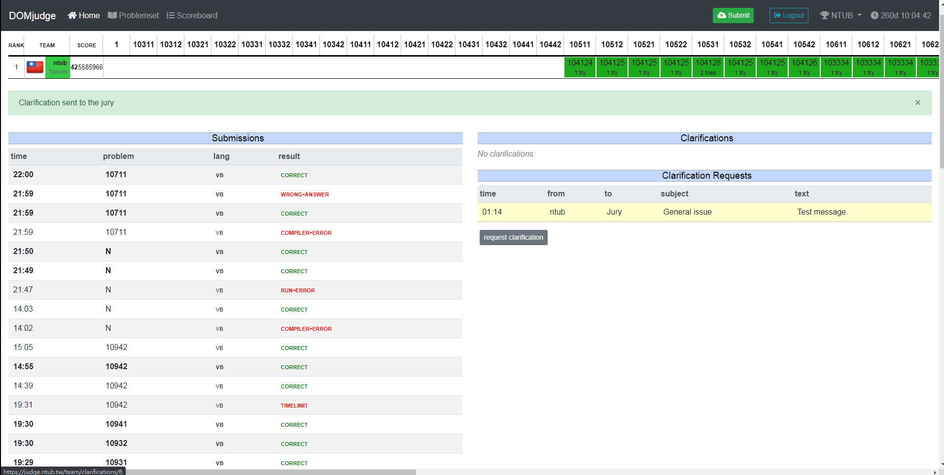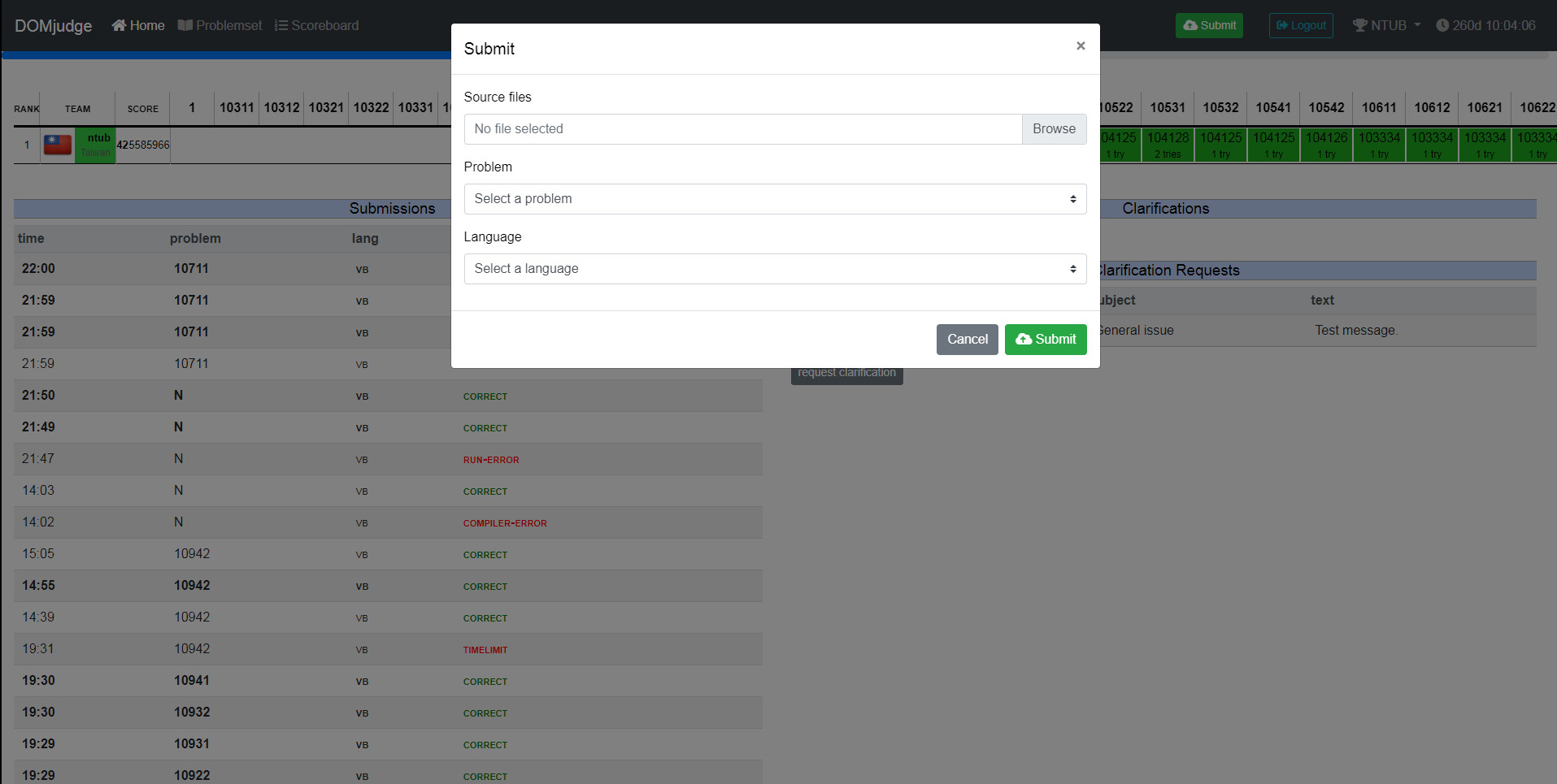 # Domjudge 學生選手端使用手冊 ## 首頁(記分板) * 深綠色 => 第一個答對 * 淺綠色 => 正確的答案 * 紅色 => 錯誤的答案 * 數字 => 從競賽開始到提交的時間(分鐘) * n try => 提交評分的次數  <!--  --> ## 題目列表 * 點選 problem text 查看題目  <!--  --> ### 檢視題目  <!--  --> ## 登入頁面  <!--  --> ### 登入後的主畫面 * Submissions 送出評分的紀錄 * result * Correct: 裁判接受提交的程式碼。 * Compiler-Error: 程式碼無法成功編譯。 * TimeLimit: 提交的程式太過耗時。 * Run-Error: 提交的程式結束時的 return code 不為零,通常是因為我們的測試資料造成你的程式非預期的結束。 * Wrong-Answer: 裁判拒絕接受提交的程式碼,因輸出不正確。 * No-Output: 提交的程式沒有輸出 * Clarifications 裁判統一發送的訊息 * Clarification Requests 詢問問題  <!--  --> ## 送出作答的程式  <!--  --> ## 選取原始碼(ex: .vb)、題目、語言  <!--  --> ## 提出問題  <!--  -->  <!--  --> ### 選擇問題的接收者、問題類型與填寫內容  <!--  --> ### 提出問題後  <!--  --> ### 檢視提出的問題  <!--  --> :::info ## [提問的智慧](https://github.com/ryanhanwu/How-To-Ask-Questions-The-Smart-Way) https://github.com/ryanhanwu/How-To-Ask-Questions-The-Smart-Way :::