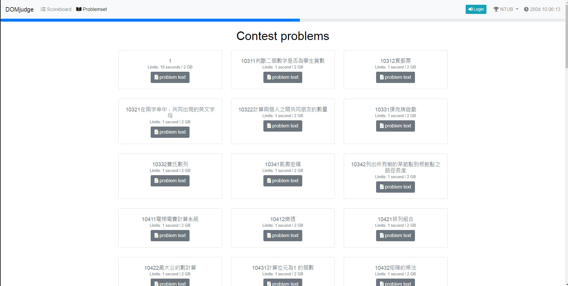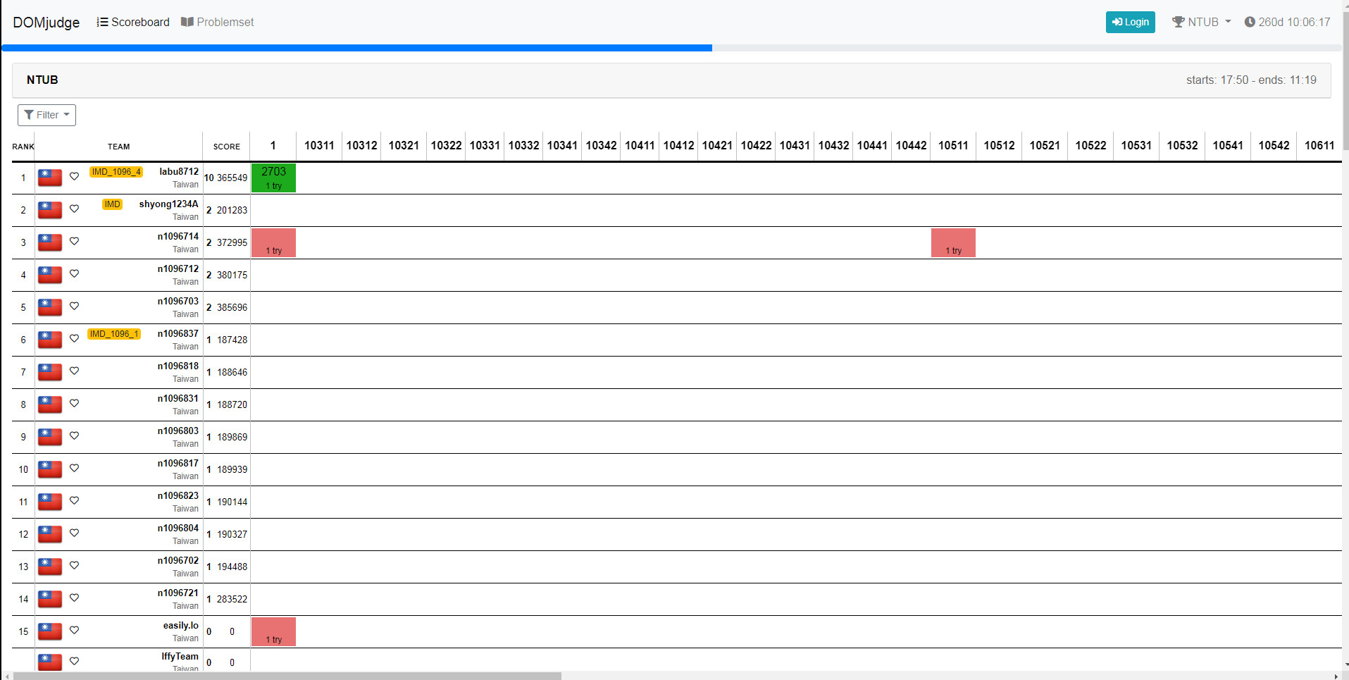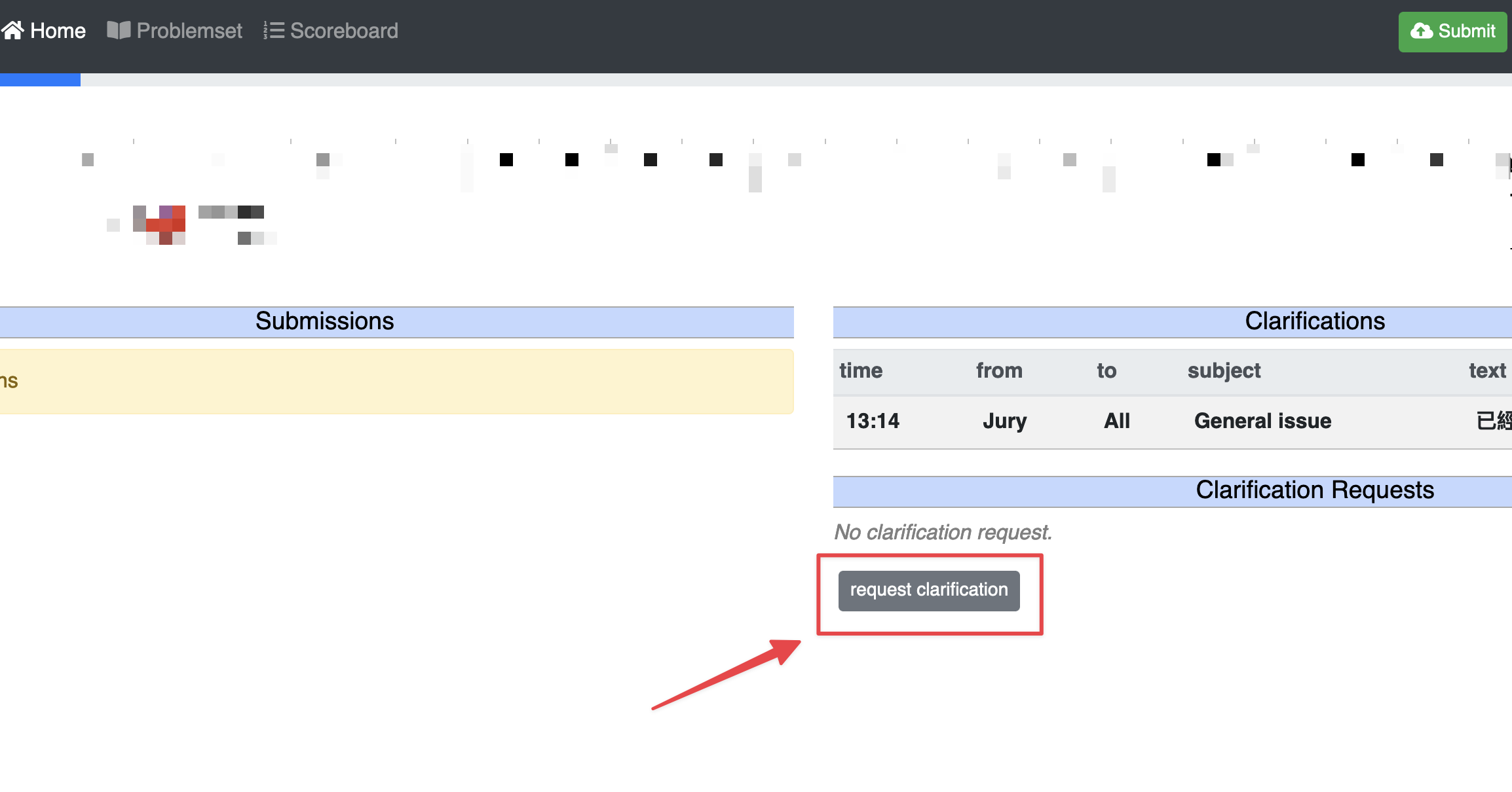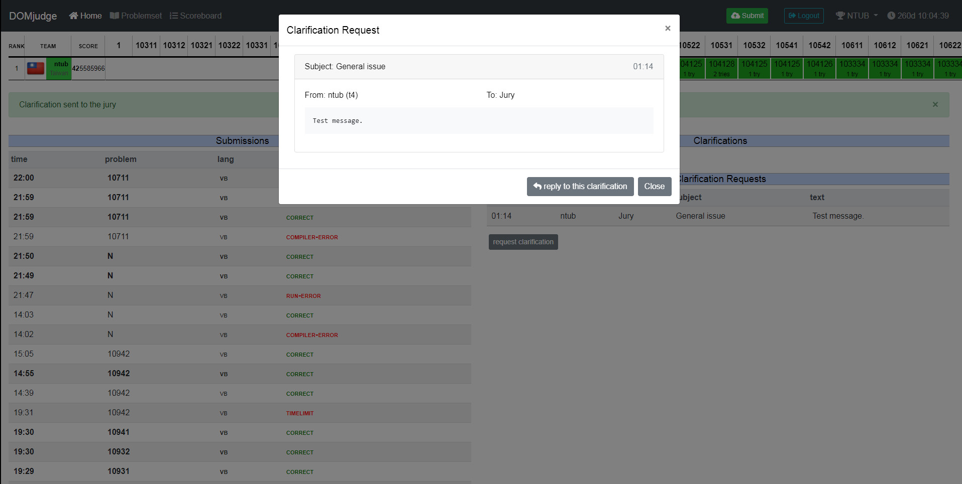 # Domjudge 學生選手端使用手冊 ## 首頁(記分板) * 深綠色 => 第一個答對 * 淺綠色 => 正確的答案 * 紅色 => 錯誤的答案 * 數字 => 從競賽開始到提交的時間(分鐘) * n try => 提交評分的次數  <!--  --> ## 題目列表 * 點選 problem text 查看題目  <!--  --> ### 檢視題目  <!--  --> ## 登入頁面  <!--  --> ### 登入後的主畫面 * Submissions 送出評分的紀錄 * result * Correct: 裁判接受提交的程式碼。 * Compiler-Error: 程式碼無法成功編譯。 * TimeLimit: 提交的程式太過耗時。 * Run-Error: 提交的程式結束時的 return code 不為零,通常是因為我們的測試資料造成你的程式非預期的結束。 * Wrong-Answer: 裁判拒絕接受提交的程式碼,因輸出不正確。 * No-Output: 提交的程式沒有輸出 * Clarifications 裁判統一發送的訊息 * Clarification Requests 詢問問題  <!--  --> ## 送出作答的程式  <!--  --> ## 選取原始碼(ex: .vb)、題目、語言  <!--  --> ## 提出問題  <!--  -->  <!--  --> ### 選擇問題的接收者、問題類型與填寫內容  <!--  --> ### 提出問題後  <!--  --> ### 檢視提出的問題  <!--  --> :::info ## [提問的智慧](https://github.com/ryanhanwu/How-To-Ask-Questions-The-Smart-Way) https://github.com/ryanhanwu/How-To-Ask-Questions-The-Smart-Way :::
