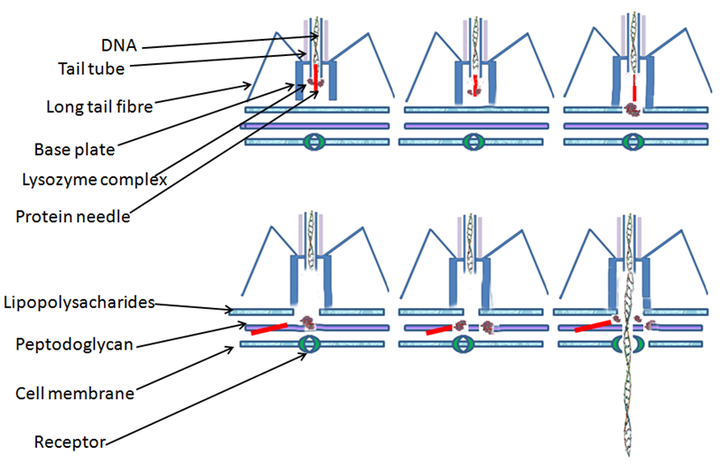 Myovirus bacteriophages use a hypodermic syringe-like motion to inject their genetic material into the cell. After contacting the appropriate receptor, the tail fibers flex to bring the base plate closer to the surface of the cell. This is known as reversible binding. Once attached completely, irreversible binding is initiated and the tail contracts, possibly with the help of ATP, present in the tail, injecting genetic material through the bacterial membrane. The injection is accomplished through a sort of bending motion in the shaft by going to the side, contracting closer to the cell and pushing back up. Podoviruses lack an elongated tail sheath like that of a myovirus, so instead, they use their small, tooth-like tail fibers enzymatically to degrade a portion of the cell membrane before inserting their genetic material.