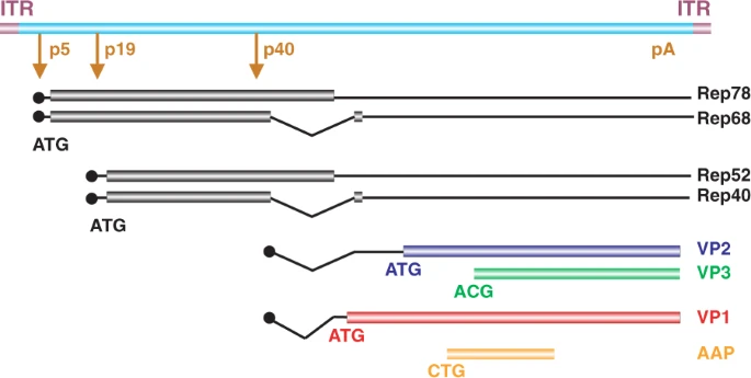 >The wild type AAVs package a 4.7 kb genome encoding non-structural (rep), structural (cap), assembly activating (aap), and membrane associated accessory (maap) proteins. AAVs have become widely used for gene therapy applications, with several advantages over other viral vectors, including a lower toxicity and the availability of over 150 naturally occurring genotypes and serotypes