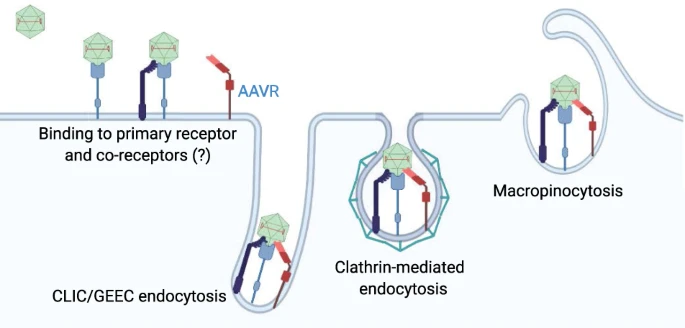 When AAV reaches the cells, it attaches to receptors/co-receptors, followed by endocytosis into the cell.