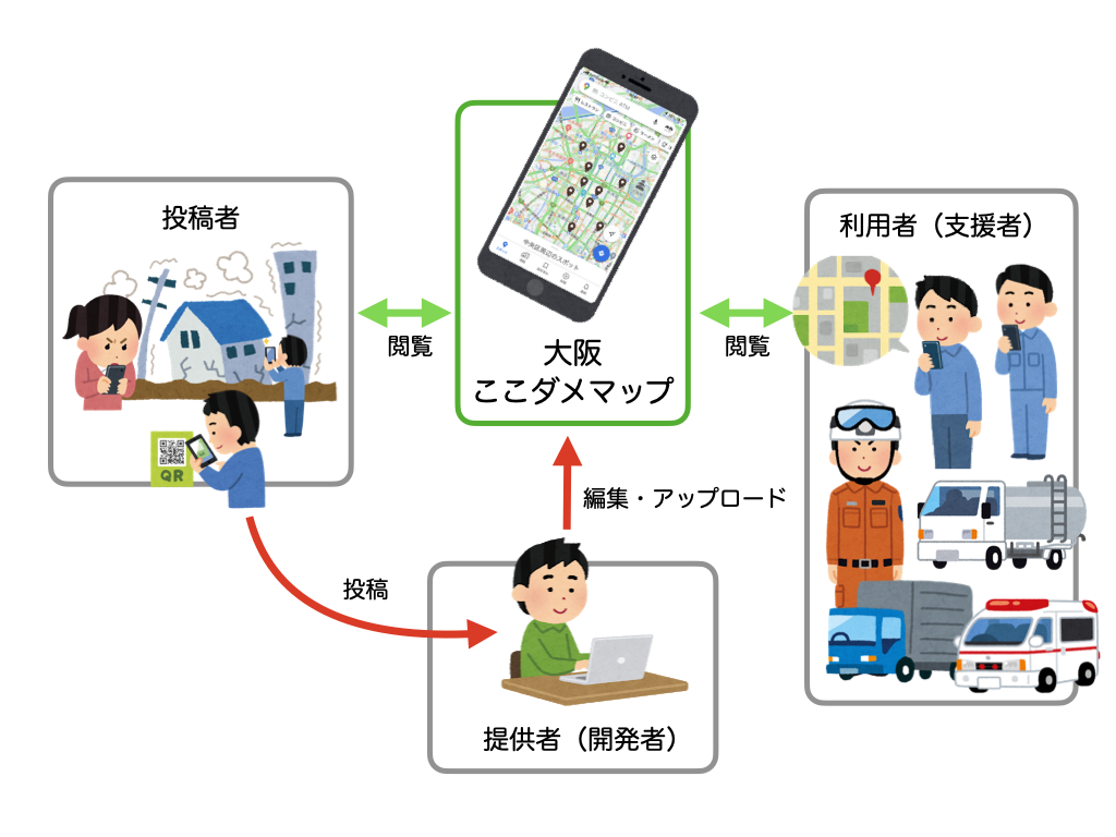 # 【Aチーム】西日本技術者GHP2020 実践研修記録シート 2021/2/20-21 ## リンク集 * [Teams(グループ用会議室)](https://teams.microsoft.com/l/meetup-join/19%3ameeting_ZDdmZjBkODQtY2I3ZS00NGZkLTk3OWEtMDhhYjcwODRlYzZl%40thread.v2/0?context=%7b%22Tid%22%3a%22c387f318-c61f-475f-9b20-990594e0caf1%22%2c%22Oid%22%3a%221b276270-0f51-4039-8a1e-ed0dccfdded1%22%7d) * [Mural(グループ用ホワイトボード)](https://app.mural.co/t/hackcamp2810/m/hackcamp2810/1613875216134/d32e11cdd4b8d83360f6278a4bf75d5f78e6cd49) * [参加者リスト](https://docs.google.com/spreadsheets/d/1qFlSBd5i2kSMFsEqOSfcG4kP9W9CuDKyP2_PrfFDQKA/edit?usp=sharing) ## チームメンバー * 本多さん * 山下さん * 吉田さん * 林さん * 竹下さん ### チームで策定したコミュニケーションルール ``` (例/前回までの実践研修で出たルール) * 複数でのディスカッションでは発言に対して肯定的な意見(協調)を出すことで議論を進める * コミュニケーションを図るには、一人ひとりの発言が重要であるので、意見がない場合でもその旨を発言する * 悩んでいる時も必ず声を出して温度感を伝えます etc... ``` * 5-10分考えて、詰まっていることやほしいアイデアを整理してからみんなに質問を投げる * タイミングを考えすぎて躊躇うより、気にせず発言する * 会話で発言できなかったアイデア・意見はチャットに投げる `↑↑ Day1 14:05くらいまでを目処に入力` --- ## 1. 取り組む課題 `あなたのチームが取り組む課題は?` 6(オリジナル).避難や物資を運搬するために、津波や火災などにより使用不可能となった道路をピックアップしたい。それを被災者や支援者がリアルタイムで確認できるようにしたい。 ## 2. 課題に対するアプローチ 「(課題)利用不可の道路状況が把握できないこと」を解決するために、 「(なんのテクノロジー)Googleマップ」と「(データ)被災者からの情報提供、スマホ位置情報、Twitter」を使い、 「(誰に/どこに)支援者」に対して、 「(どういう方法で)避難場所にQRコード設置/衛星データ(難Googleマップ)」をして、 「(どんな風に解決する)道路状況を可視化できる」ようになる。 ## 3. 役割分担 `あなたのチームに必要な役割のみ項目を残して活用してください` * 進行管理:吉田さん * データ収集:●●さん * ドキュメント整備(このHackMDの利用を推奨):山下さん * コミュニケーションデザイン:竹下さん * 開発:(QGIS)本多さん、(マイマップ)林さん * デザイン:●●さん `↑↑ Day1 15:30くらいまでを目処に入力` --- ## 4. 中間報告 ### a. 選択した課題 大地震時に利用不可の道路状況が把握できないこと ### b. 開発進捗概要 開発イメージのすり合わせおよび役割分担の決定 ### c. チーム運営・コミュニケーションについて 決定した役割でそれぞれ作業開始 ### d. 技術について Googleマイマップを利用してQGISで作成したレイヤを被せる ### e. チームの成長・得られた観点 地震発生時を模倣して、即席のメンバーで課題に取り組み始められたこと ### f. 困っていること・ヘルプが欲しいこと 開発の人手が足りなくなるかもしれない `↑↑ Day1 17:00までに入力` --- ## 5. サービス内容 ### サービスの名前:「大阪ここダメマップ」  ### a. ターゲット(主人公) 災害時(特に大震災時)に被災地へ支援に向かう方が、通行不可の道路をリアルタイムで把握できるサービス。 ### b. 課題の背景 大震災時、避難所などに向かう支援者が安全にかつ問題なく通行できる道路はすぐには把握できず、なかなかたどり着けないことが往々にしてあります。その時、このサービスを利用すれば、通行不可の道路を避けて、目的地にたどり着けるのではないかと考え、このサービスをリリースします。 ### c. 使う技術 Google マイマップ https://www.google.com/maps/d/u/0/viewer?hl=ja&mid=1XjrO2SEbOyYxHdUEeys4_62_rH03KcAl&ll=34.703191286244504,135.47453947715206&z=14 Google フォーム https://docs.google.com/forms/d/e/1FAIpQLSfq3_qjXcM2c2kWc6jxZnBXE3wd0EAEew76Un1Z0o9cJZS3gQ/viewform スマートフォン(情報提供者) QGIS QRコード ### d. 使うデータ Google フォームにて投稿してもらうデータを利用。 QGIS * マップナビおおさかオープンデータ(大阪市) https://www.city.osaka.lg.jp/toshikeikaku/page/0000250227.html * 防災関連施設エリアデータ(避難経路) * 防災関連施設エリアデータ(緊急交通路_広域(重点14路線)) * 防災関連施設エリアデータ(緊急交通路_広域(重点14路線以外)) * 防災関連施設エリアデータ(緊急交通路_地域) * 緊急輸送道路 第1.1版 https://nlftp.mlit.go.jp/ksj/gml/datalist/KsjTmplt-N10-v1_1.html#prefecture27 * Geolonia 住所データ https://geolonia.github.io/japanese-addresses/ ### e. サービスの内容・特徴 被災地でGoogle フォームを利用して、通行不可道路を投稿してもらう。 その情報をもとにGoogleマイマップにQGISで作成したレイヤを被せて、 マップ上に道路状況を表示する。 既存の技術を使っているから、早くできる。早く動く。 実際、昨日の夕方には動いていた。 ### f. 課題と解決に関わるステークホルダーとその役割  1.投稿者 被災地で道路状況をGoogle フォームにて投稿してもらう。 この情報が多ければ多いほど精度が上がり、支援が円滑に行われる。 2.提供者(開発者) 投稿され