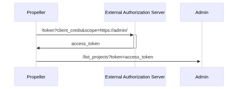 [](https://mermaid-js.github.io/mermaid-live-editor/#/edit/eyJjb2RlIjoic2VxdWVuY2VEaWFncmFtXG4gICAgUHJvcGVsbGVyLT4-K0V4dGVybmFsIEF1dGhvcml6YXRpb24gU2VydmVyOiAvdG9rZW4_Y2xpZW50X2NyZWRzJnNjb3BlPWh0dHBzOi8vYWRtaW4vXG4gICAgRXh0ZXJuYWwgQXV0aG9yaXphdGlvbiBTZXJ2ZXItPj4tUHJvcGVsbGVyOiBhY2Nlc3NfdG9rZW5cbiAgICBQcm9wZWxsZXItPj4rQWRtaW46IC9saXN0X3Byb2plY3RzP3Rva2VuPWFjY2Vzc190b2tlbiIsIm1lcm1haWQiOnsidGhlbWUiOiJuZXV0cmFsIn0sInVwZGF0ZUVkaXRvciI6ZmFsc2V9)
