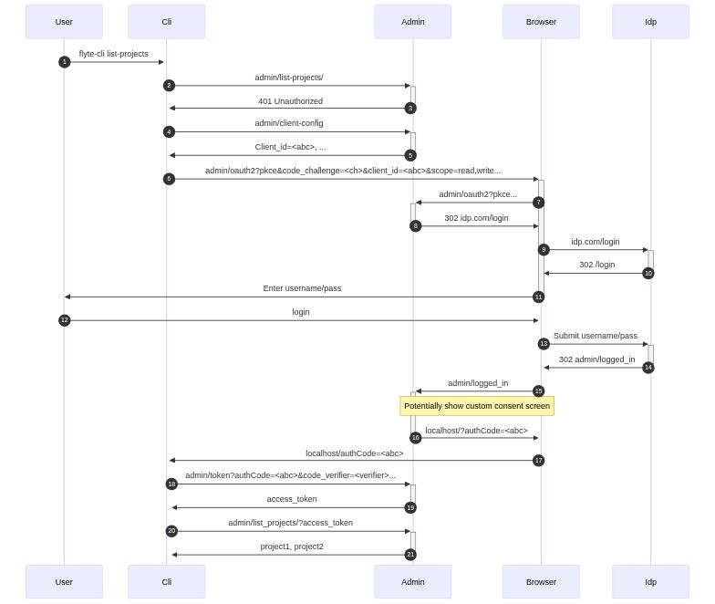 [](https://mermaid-js.github.io/mermaid-live-editor/#/edit/eyJjb2RlIjoic2VxdWVuY2VEaWFncmFtXG4gICAgYXV0b251bWJlclxuICAgIFVzZXItPj4rQ2xpOiBmbHl0ZS1jbGkgbGlzdC1wcm9qZWN0c1xuICAgIENsaS0-PitBZG1pbjogYWRtaW4vbGlzdC1wcm9qZWN0cy9cbiAgICBBZG1pbi0-Pi1DbGk6IDQwMSBVbmF1dGhvcml6ZWRcbiAgICBDbGktPj4rQWRtaW46IGFkbWluL2NsaWVudC1jb25maWdcbiAgICBBZG1pbi0-Pi1DbGk6IENsaWVudF9pZD08YWJjPiwgLi4uXG4gICAgQ2xpLT4-K0Jyb3dzZXI6IGFkbWluL29hdXRoMj9wa2NlJmNvZGVfY2hhbGxlbmdlPTxjaD4mY2xpZW50X2lkPTxhYmM-JnNjb3BlPXJlYWQsd3JpdGUuLi5cbiAgICBCcm93c2VyLT4-K0FkbWluOiBhZG1pbi9vYXV0aDI_cGtjZS4uLlxuICAgIEFkbWluLT4-LUJyb3dzZXI6IDMwMiBpZHAuY29tL2xvZ2luXG4gICAgQnJvd3Nlci0-PitJZHA6IGlkcC5jb20vbG9naW5cbiAgICBJZHAtPj4tQnJvd3NlcjogMzAyIC9sb2dpblxuICAgIEJyb3dzZXItPj4tVXNlcjogRW50ZXIgdXNlcm5hbWUvcGFzc1xuICAgIFVzZXItPj4rQnJvd3NlcjogbG9naW5cbiAgICBCcm93c2VyLT4-K0lkcDogU3VibWl0IHVzZXJuYW1lL3Bhc3NcbiAgICBJZHAtPj4tQnJvd3NlcjogMzAyIGFkbWluL2xvZ2dlZF9pblxuICAgIEJyb3dzZXItPj4rQWRtaW46IGFkbWluL2xvZ2dlZF9pblxuICAgIE5vdGUgb3ZlciBCcm93c2VyLEFkbWluOiBQb3RlbnRpYWxseSBzaG93IGN1c3RvbSBjb25zZW50IHNjcmVlblxuICAgIEFkbWluLT4-LUJyb3dzZXI6IGxvY2FsaG9zdC8_YXV0aENvZGU9PGFiYz5cbiAgICBCcm93c2VyLT4-K0NsaTogbG9jYWxob3N0L2F1dGhDb2RlPTxhYmM-XG4gICAgQ2xpLT4-K0FkbWluOiBhZG1pbi90b2tlbj9hdXRoQ29kZT08YWJjPiZjb2RlX3ZlcmlmaWVyPTx2ZXJpZmllcj4uLi5cbiAgICBBZG1pbi0-Pi1DbGk6IGFjY2Vzc190b2tlblxuICAgIENsaS0-PitBZG1pbjogYWRtaW4vbGlzdF9wcm9qZWN0cy8_YWNjZXNzX3Rva2VuXG4gICAgQWRtaW4tPj4tQ2xpOiBwcm9qZWN0MSwgcHJvamVjdDJcbiIsIm1lcm1haWQiOnt9LCJ1cGRhdGVFZGl0b3IiOmZhbHNlfQ)