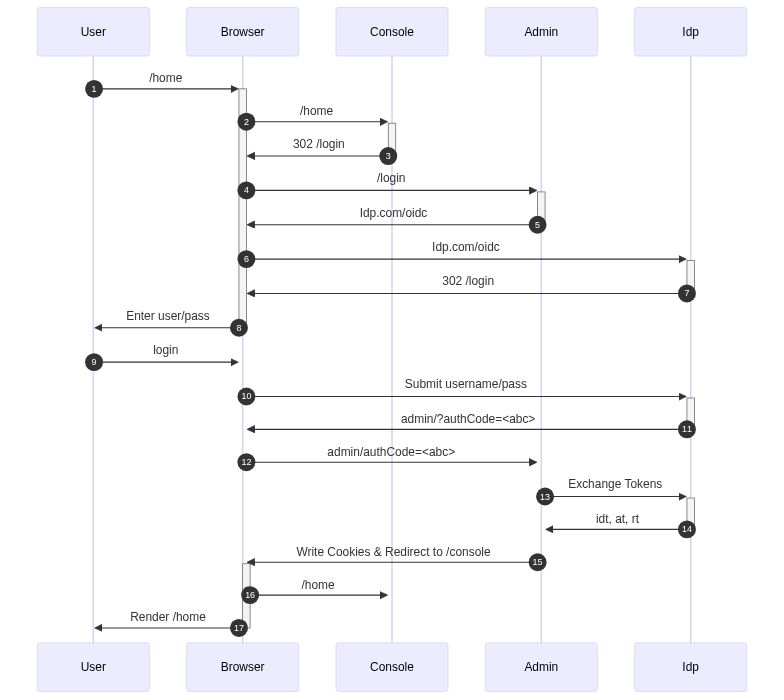 [](https://mermaid-js.github.io/mermaid-live-editor/#/edit/eyJjb2RlIjoic2VxdWVuY2VEaWFncmFtXG4lJXtjb25maWc6IHsgJ2ZvbnRGYW1pbHknOiAnTWVubG8nLCAnZm9udFNpemUnOiAxMCwgJ2ZvbnRXZWlnaHQnOiAxMDB9IH0lJVxuICAgIGF1dG9udW1iZXJcbiAgICBVc2VyLT4-K0Jyb3dzZXI6IC9ob21lXG4gICAgQnJvd3Nlci0-PitDb25zb2xlOiAvaG9tZVxuICAgIENvbnNvbGUtPj4tQnJvd3NlcjogMzAyIC9sb2dpblxuICAgIEJyb3dzZXItPj4rQWRtaW46IC9sb2dpblxuICAgIEFkbWluLT4-LUJyb3dzZXI6IElkcC5jb20vb2lkY1xuICAgIEJyb3dzZXItPj4rSWRwOiBJZHAuY29tL29pZGNcbiAgICBJZHAtPj4tQnJvd3NlcjogMzAyIC9sb2dpblxuICAgIEJyb3dzZXItPj4tVXNlcjogRW50ZXIgdXNlci9wYXNzXG4gICAgVXNlci0-PitCcm93c2VyOiBsb2dpblxuICAgIEJyb3dzZXItPj4rSWRwOiBTdWJtaXQgdXNlcm5hbWUvcGFzc1xuICAgIElkcC0-Pi1Ccm93c2VyOiBhZG1pbi8_YXV0aENvZGU9PGFiYz5cbiAgICBCcm93c2VyLT4-K0FkbWluOiBhZG1pbi9hdXRoQ29kZT08YWJjPlxuICAgIEFkbWluLT4-K0lkcDogRXhjaGFuZ2UgVG9rZW5zXG4gICAgSWRwLT4-LUFkbWluOiBpZHQsIGF0LCBydFxuICAgIEFkbWluLT4-K0Jyb3dzZXI6IFdyaXRlIENvb2tpZXMgJiBSZWRpcmVjdCB0byAvY29uc29sZVxuICAgIEJyb3dzZXItPj4rQ29uc29sZTogL2hvbWVcbiAgICBCcm93c2VyLT4-LVVzZXI6IFJlbmRlciAvaG9tZVxuIiwibWVybWFpZCI6eyJ0aGVtZSI6Im5ldXRyYWwifSwidXBkYXRlRWRpdG9yIjpmYWxzZX0)