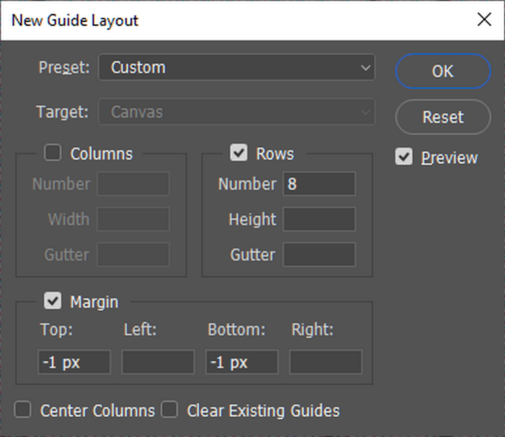 This guide layout will divine the image into 8 rows and we cleaning each of them one by one. (The margin is just to make sure it doesn't overlap the border pixel line)