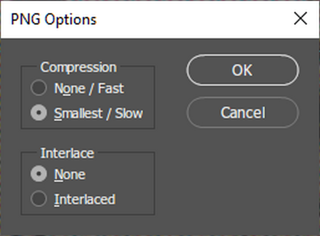 Self-explanatory step. Preferably, save with maximum compression option. Interlacing doesn't help anything for images like this so just turn it off. [Interlacing](https://en.wikipedia.org/wiki/Interlacing_(bitmaps))