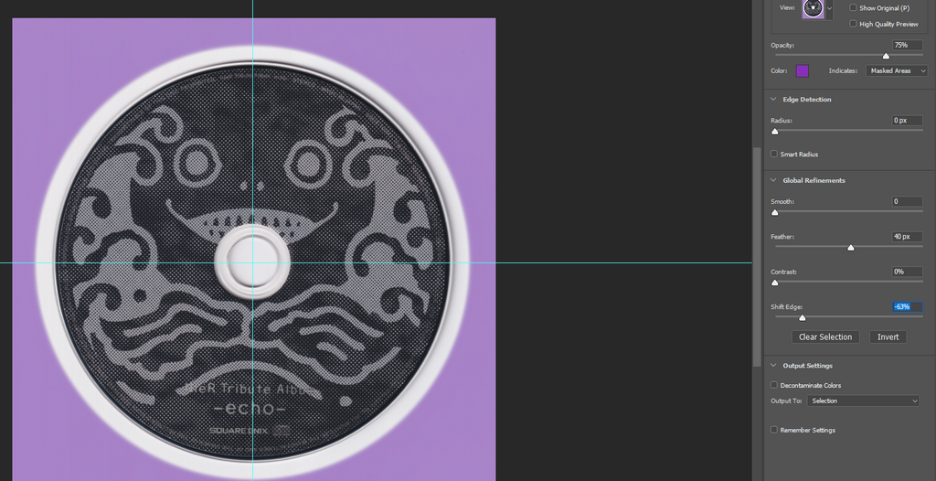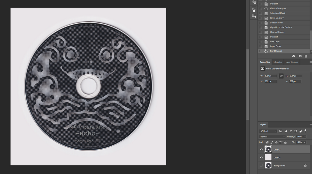 Then clear the guides. press `G` to select the `Paintbucket Tool (G)`. press `Alt` in the outer of the disc image to select the background color. Then create a new blank layer. Paint it with the color you just select then move it under the disc only layer.