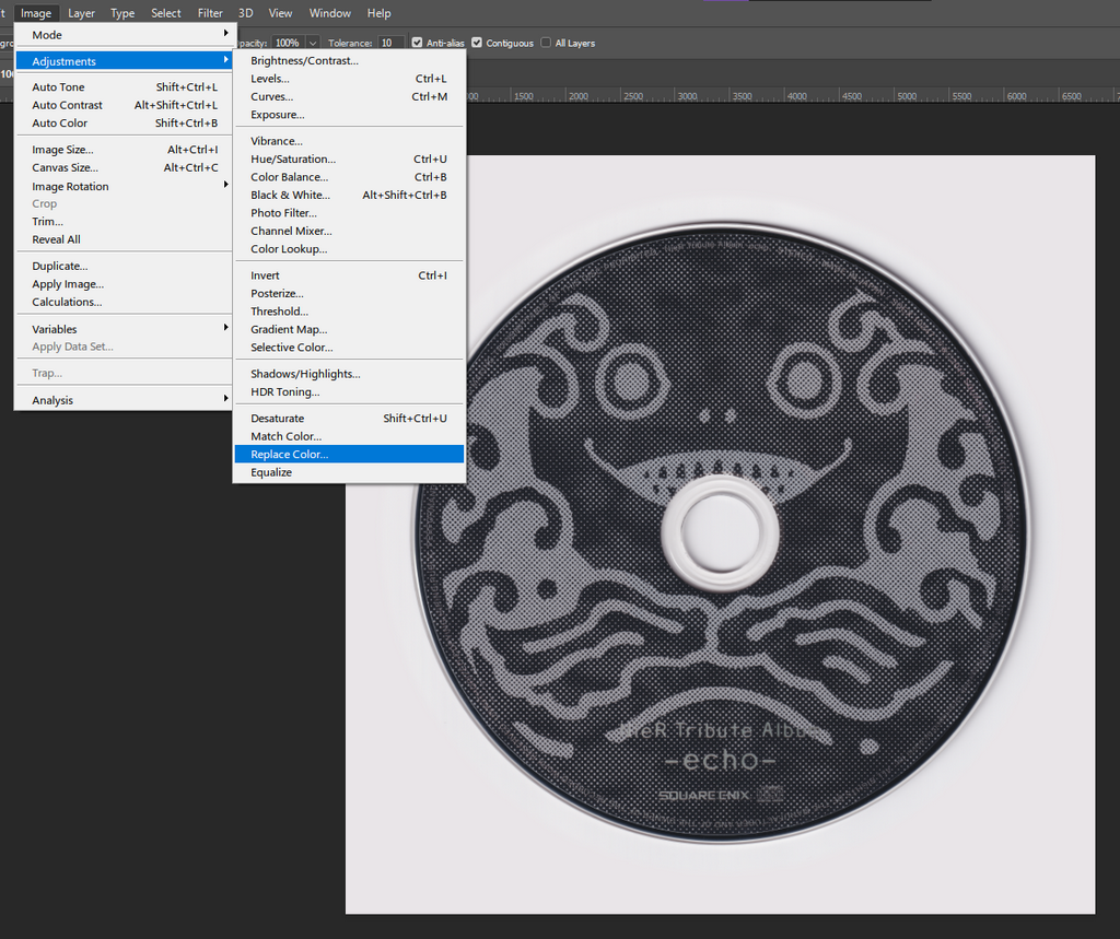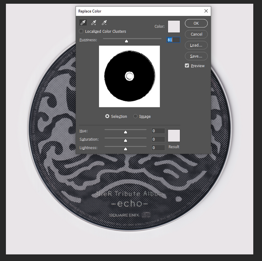 First picking the background color while the `Replace Color` window opens. Change the `Fuzziness` value until it's no longer has anything inside the disc.