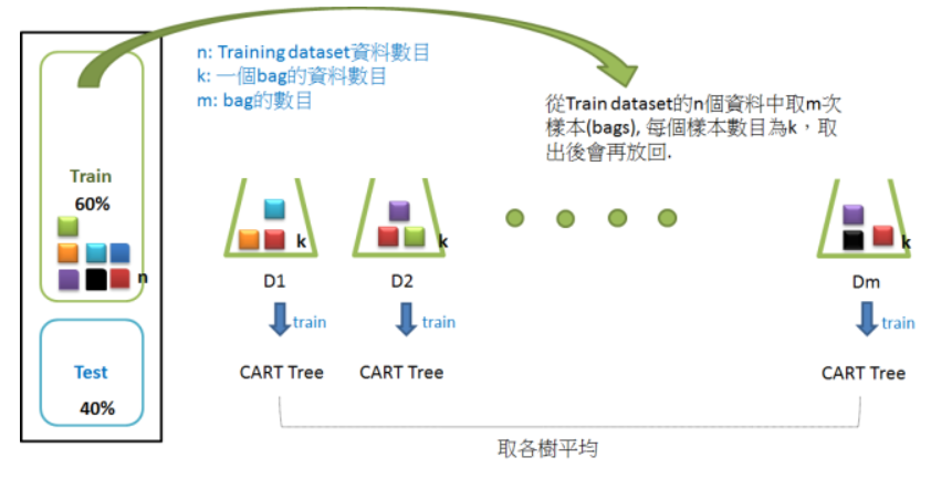 Random Forest,結合多顆CART樹(CART樹為使用GINI算法的決策樹),並加入隨機分配的訓練資料,以大幅增進最終的運算結果。