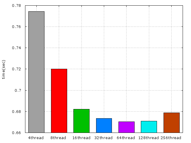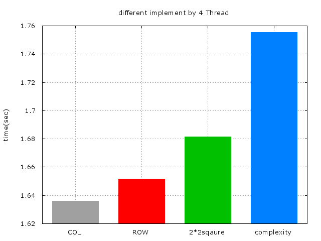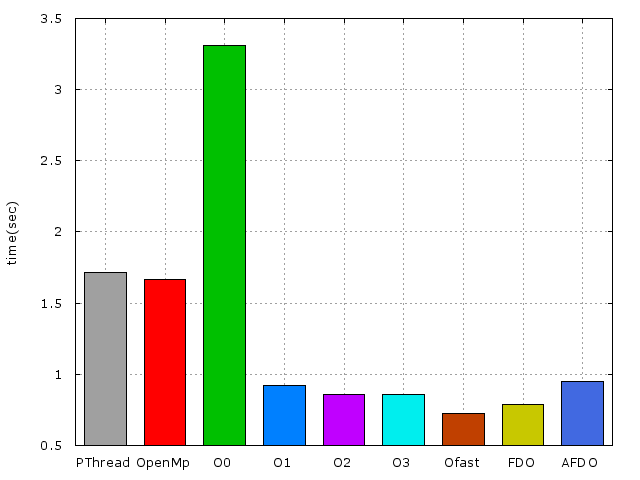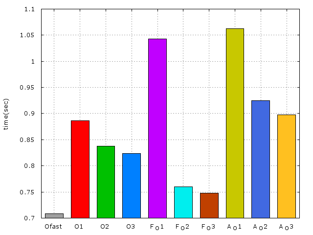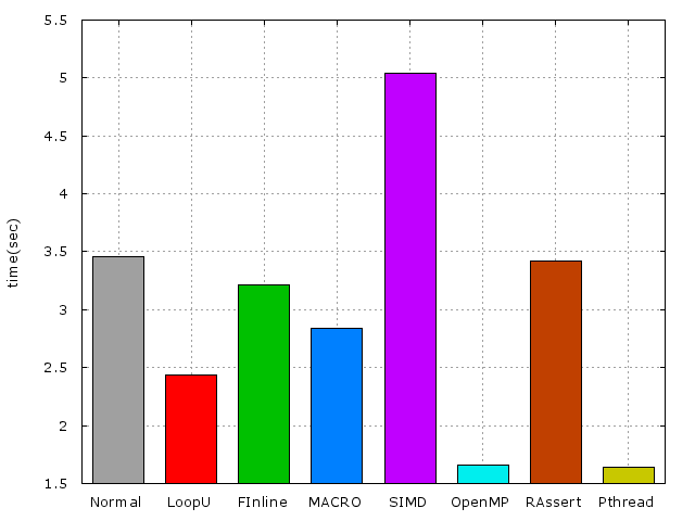 以下爲使用x86_64-pc-linux-gnu-gcc編譯及不同實做的效能比較
