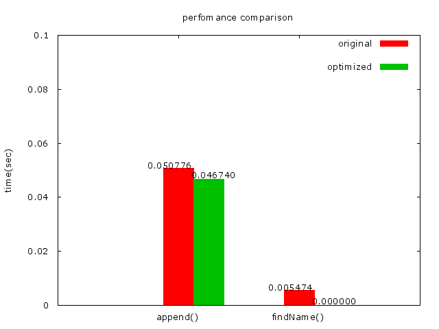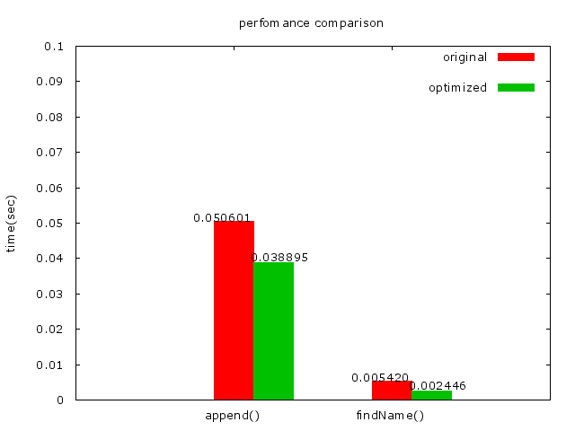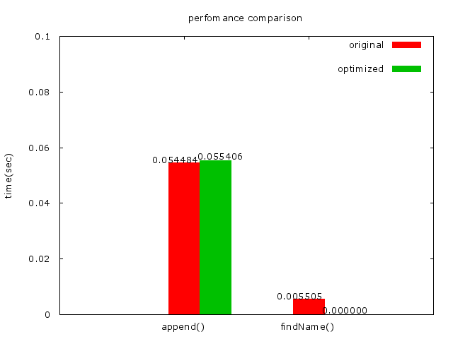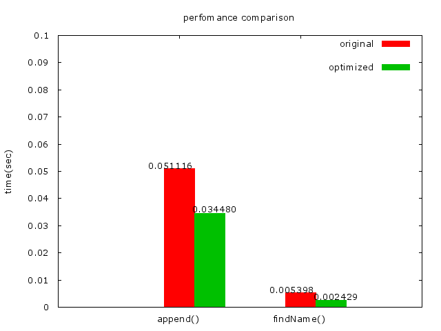 * Cache miss 大大減少了很多!可是append的時間卻加長了一點,相信findName的時間也相對的減少了很多,但findName的時間在表中已經見底了,所以看不出來。