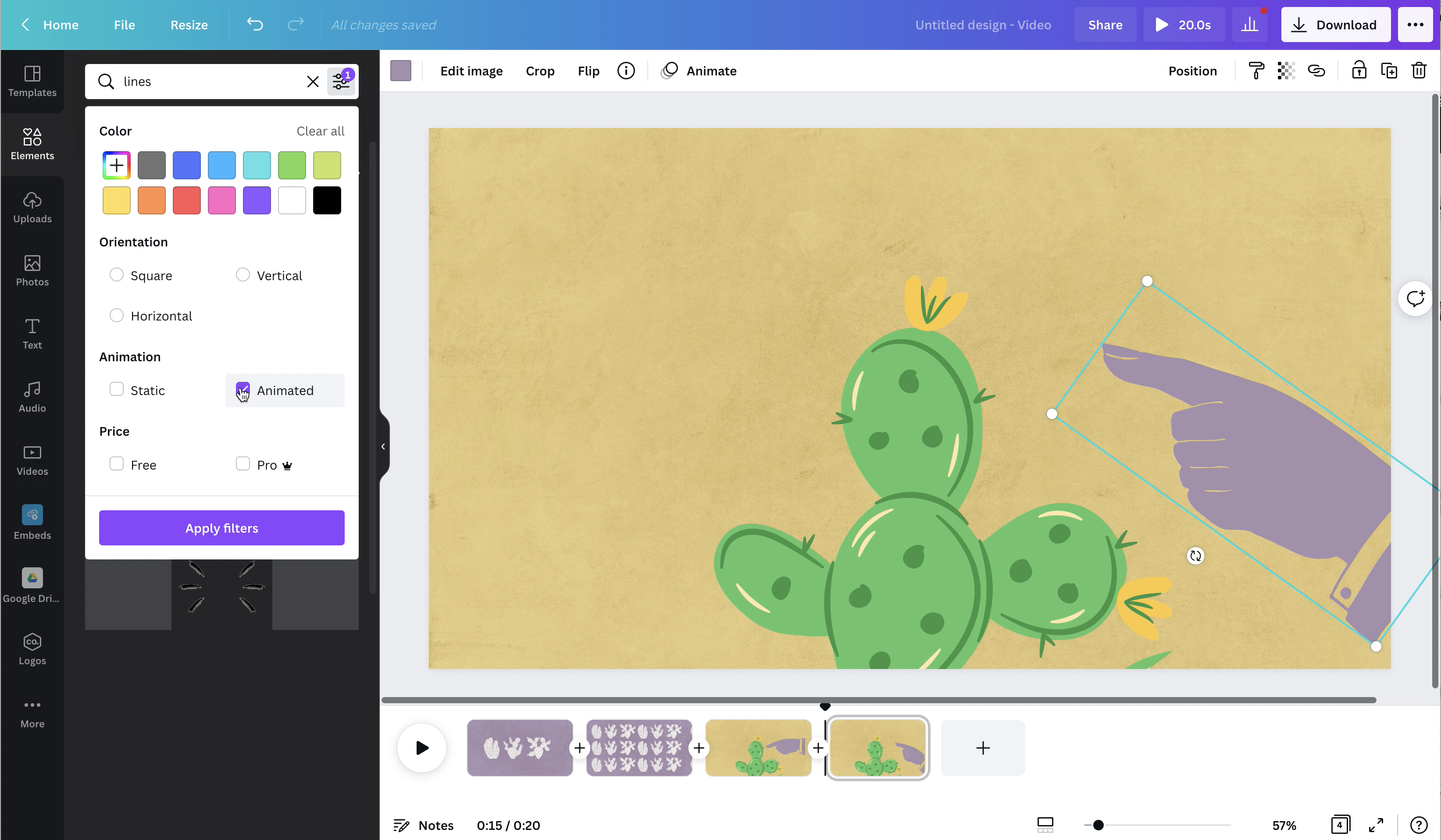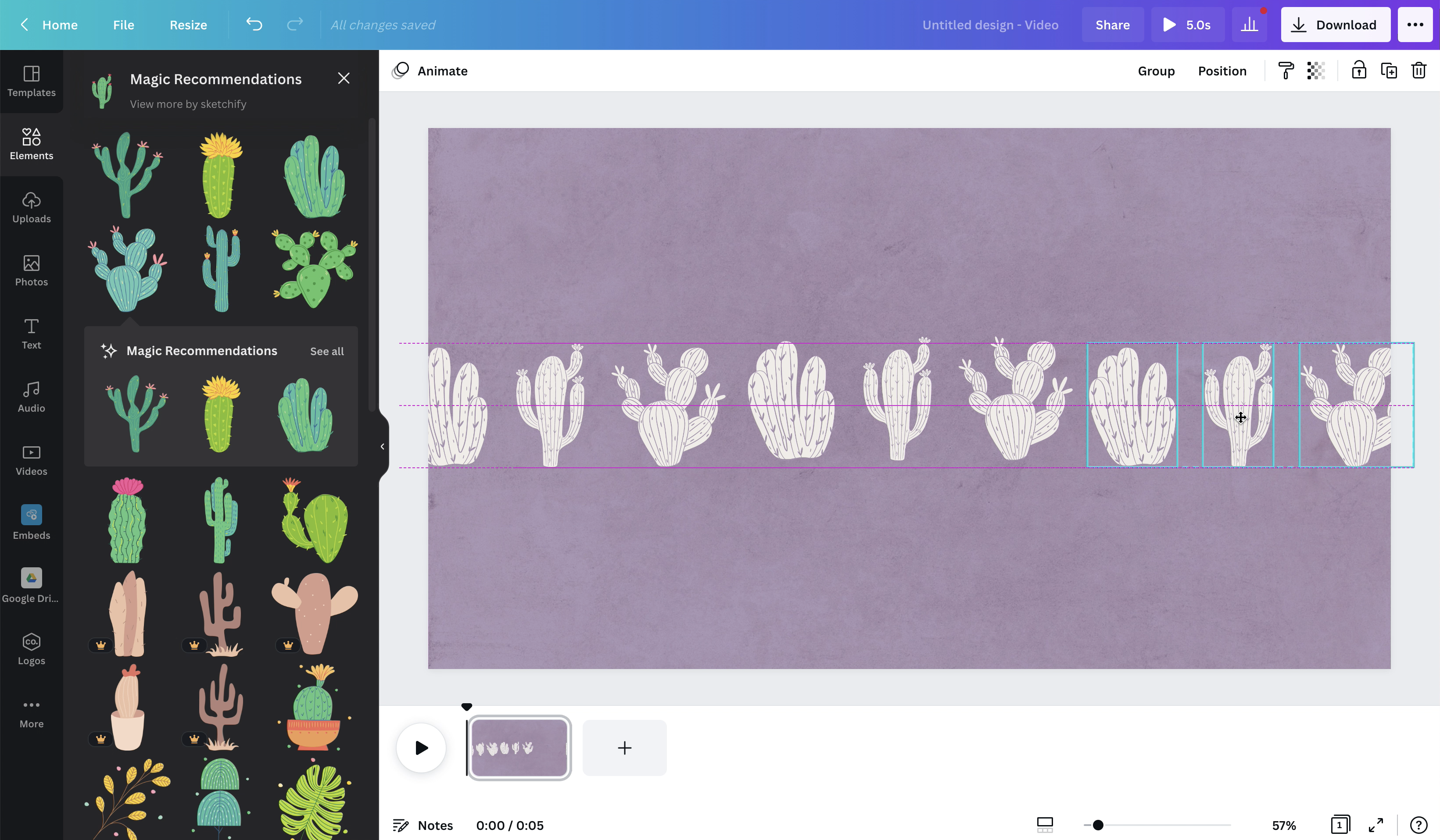 4. add graphical elements. In Elements section, search for graphics that you want to use. You can also edit the colors of the graphics to fit your overall aesthetic.